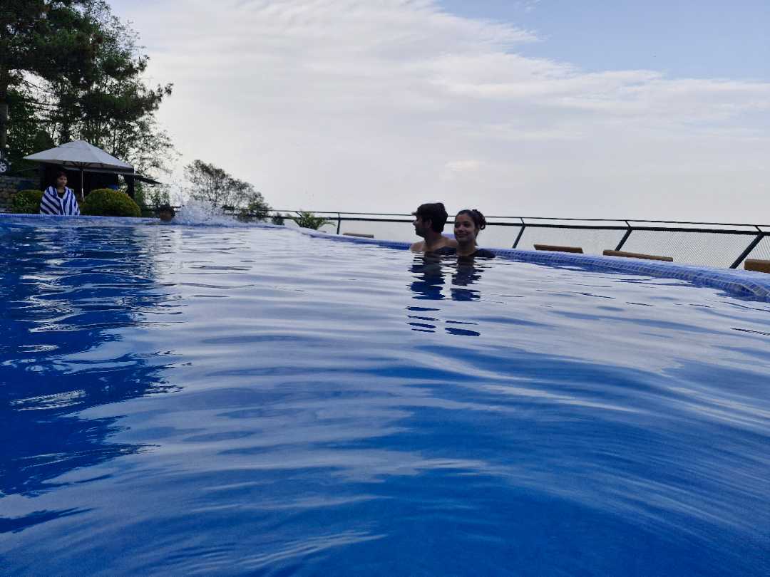 Property is located in secluded nagarkot area on the top hill. Sunrise facing Hotel Country Villa. Rooms with balcony. Average size room. Sufficient for 2adults and a kid. Food is decent less non spicy. Non veg is more available than veg. Paneer butter masala, mushroom curry, veg sizzler, soups and biryani was available and tasty. Ample area for sitouts with multiple level sitting area. Swimming pool temperature controlled available. Overall 4. 5 star rating.