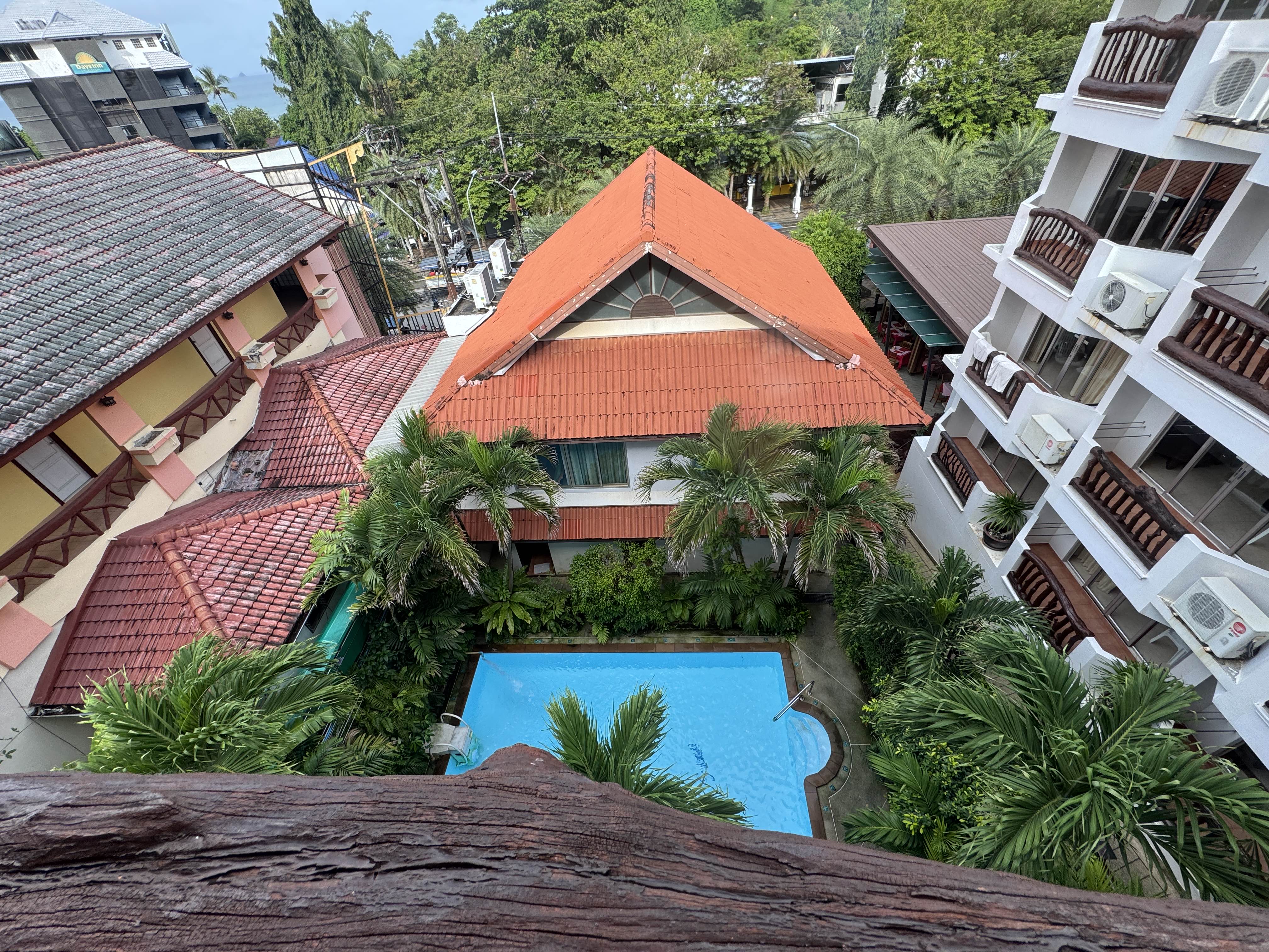 This is a quiet and cozy wooden furniture stay on the Aonang beach, the market , massage , and eateries are just outside the Aonang Sunset Hotel , beach is 2 mins walk, despite being on the road side it is quiet and cozy, staff is humble and prompt and will help you for other island tours airport drops and transfers as well. we didn't opt for food as we are vegetarian, but many vegetarian eateries are on walking distance besides you get fruit smoothies nearby. swimming pool is another added bonus, the room has all the necessary things like hair drier, fridge, ac, locker, table etc, rooms are very spacious with balcony, in all a much recommended stay