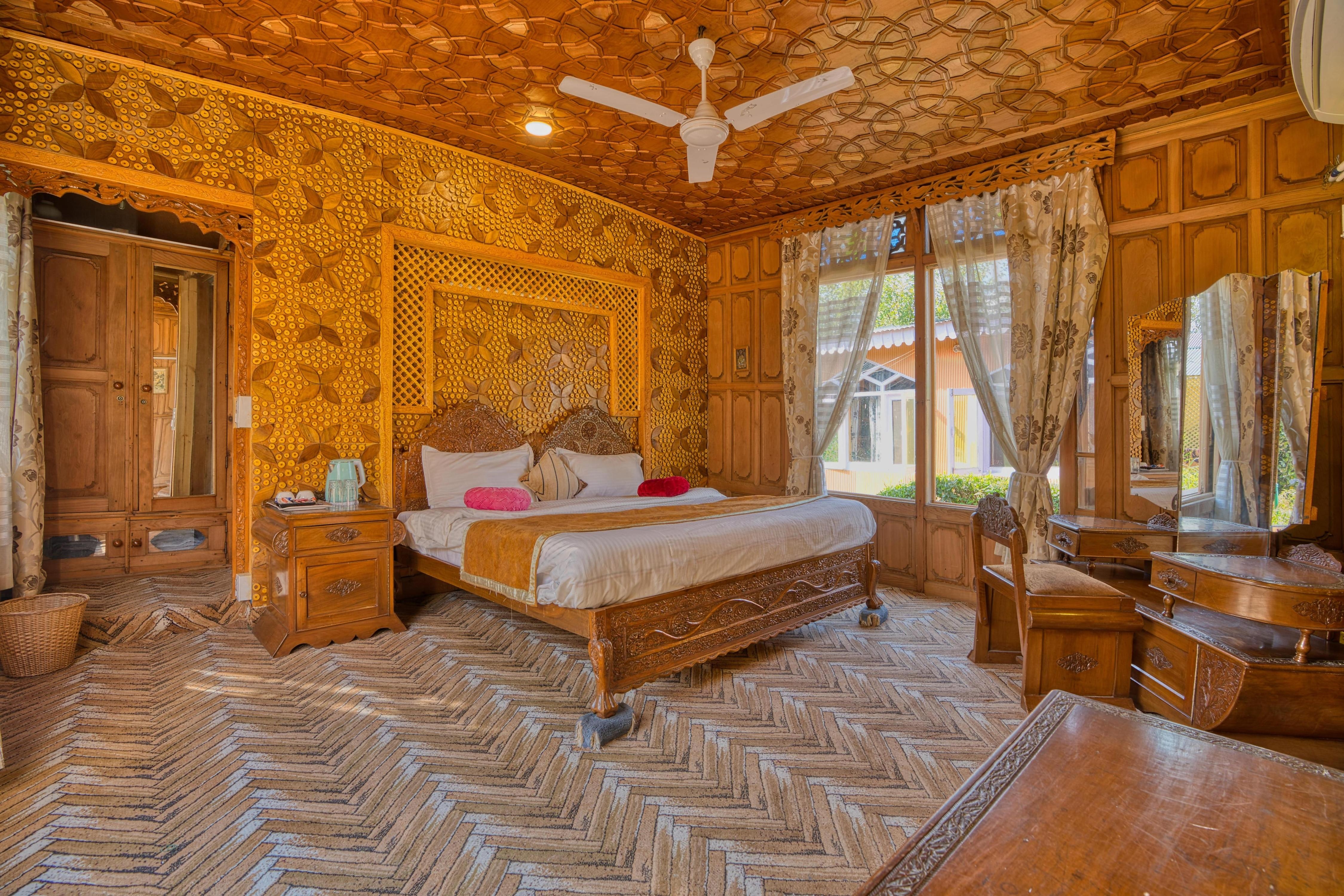 Stay on a traditional houseboat in Srinagar featuring lake views, Kashmiri interiors & multi-cuisine dining. More
