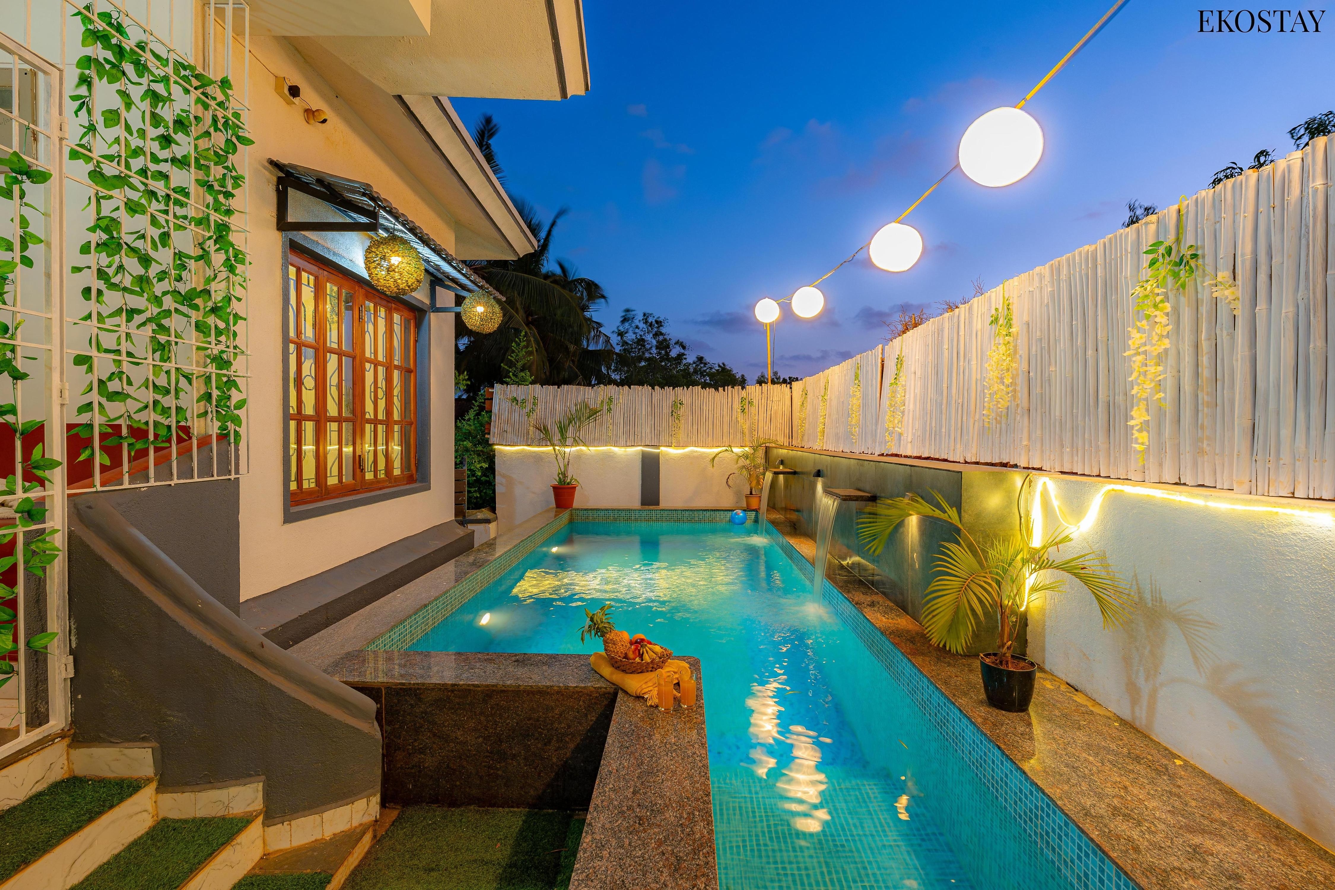 Pet-friendly 4 BHK pool villa with a kitchen & caretaker