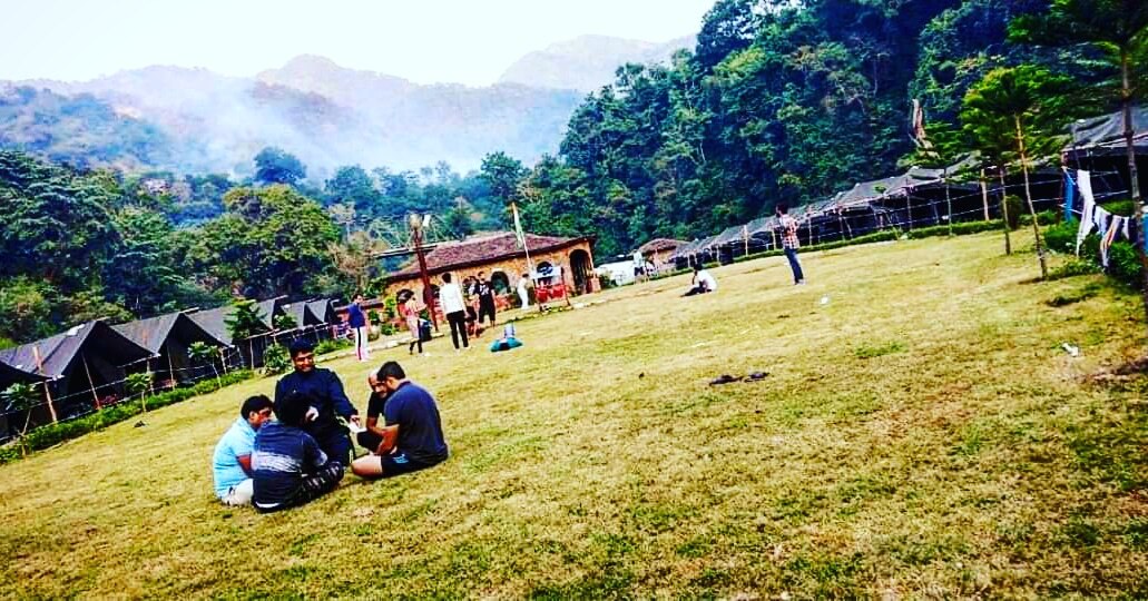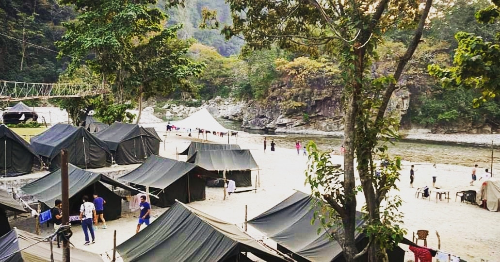 Tents in a river-side camp with lawn, restaurant, bonfire & tours