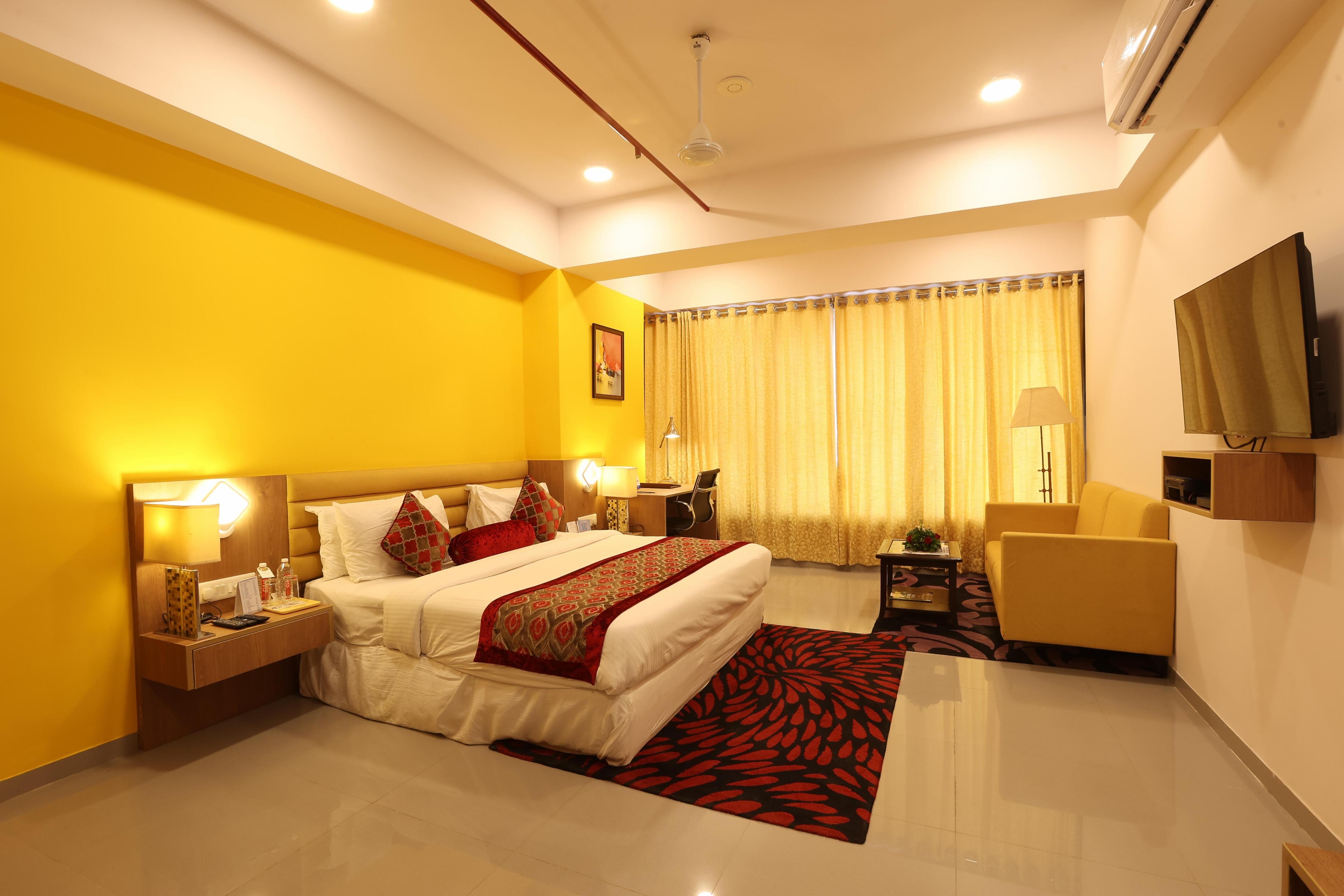 Located close to business hubs in Gandhinagar, the hotel features rooms with balconies and a multi-cuisine restaurant. More