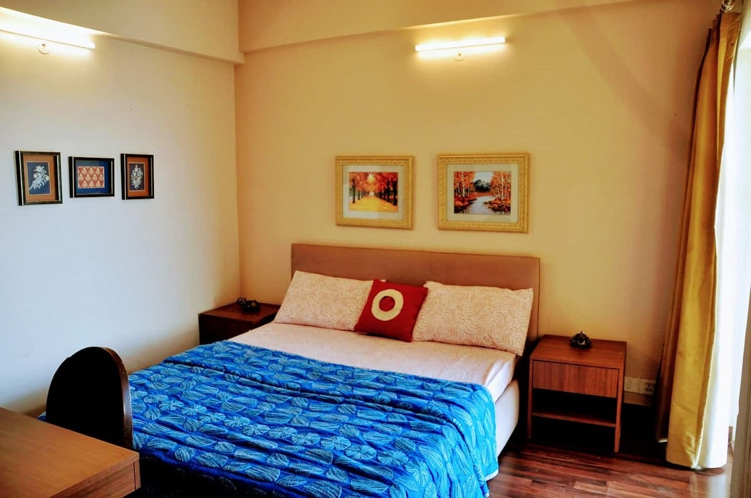 Spacious bedroom at a serene place with a beautiful green urban view from the balcony. The room has AC, study table, king-size b ...Read moreLogin to unlock deals & manage your bookings!