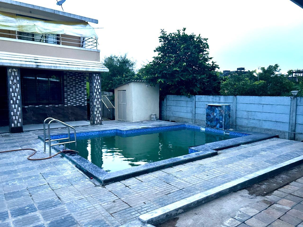 - The property is an air-conditioned 3 BHK villa (232 sq. m.) featuring a private swimming pool, living room with a sofa bed and balcony/terrace.