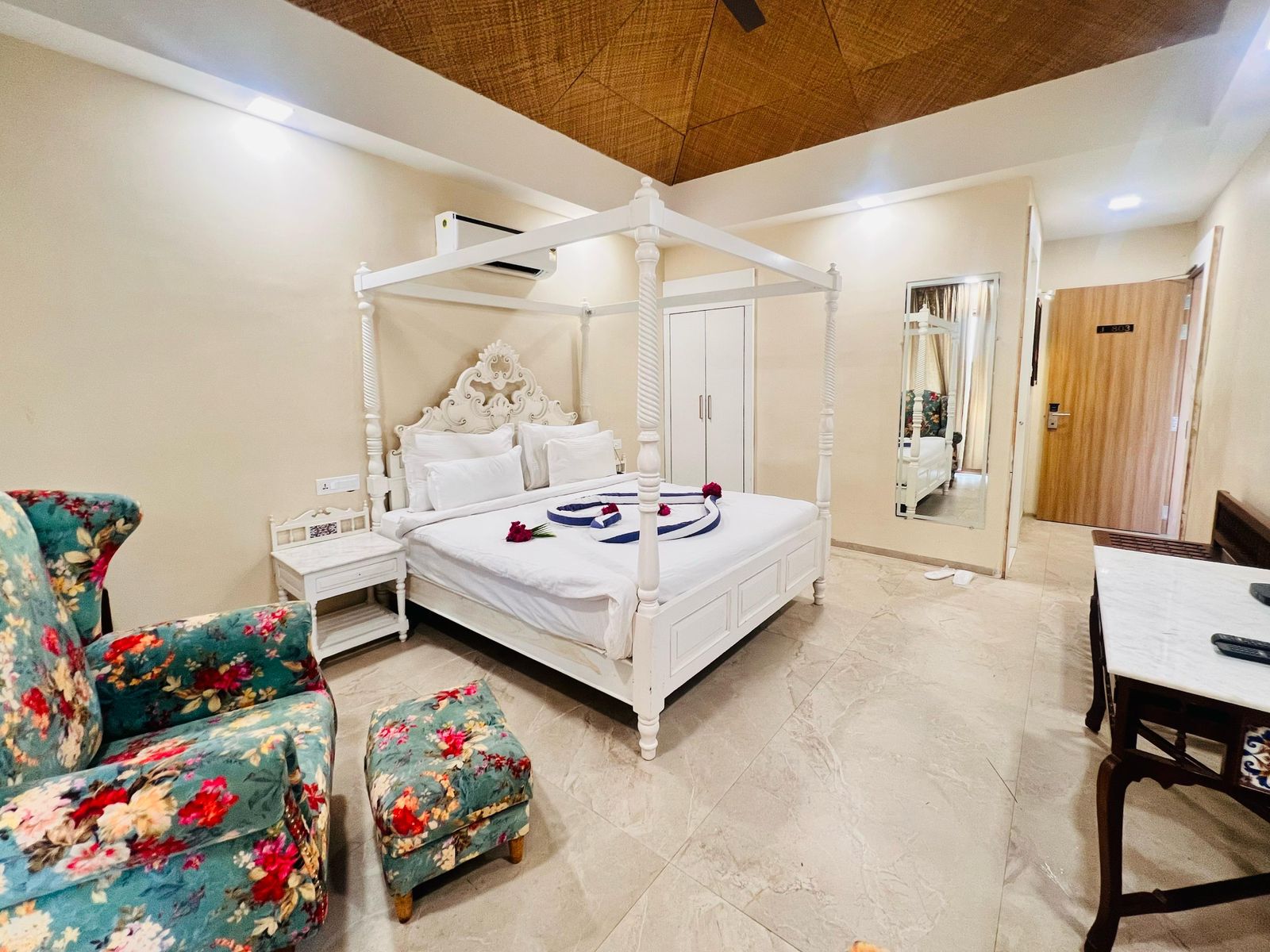 - The Super Deluxe Cottage and Pool Cottage are spread across an area of 651 sq. ft and feature a sumptuous king bed and a balcony. Moreover, it offers stunning views of the garden.