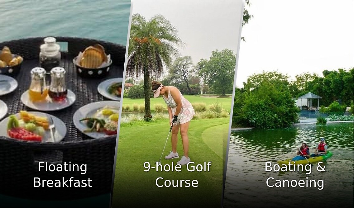 Rest in style with Karma Lakelands, featuring hot tubs, bars, and an expansive swimming pool. More