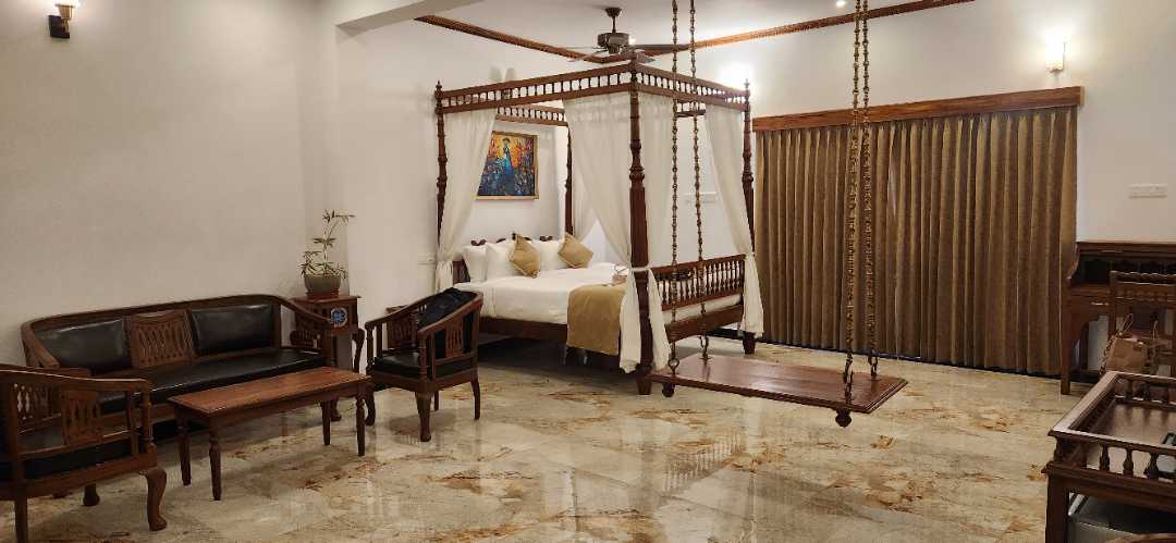 • The King Suite showcases heritage-inspired elegance with a spacious balcony, a Jacuzzi bathtub, and a traditional swing.