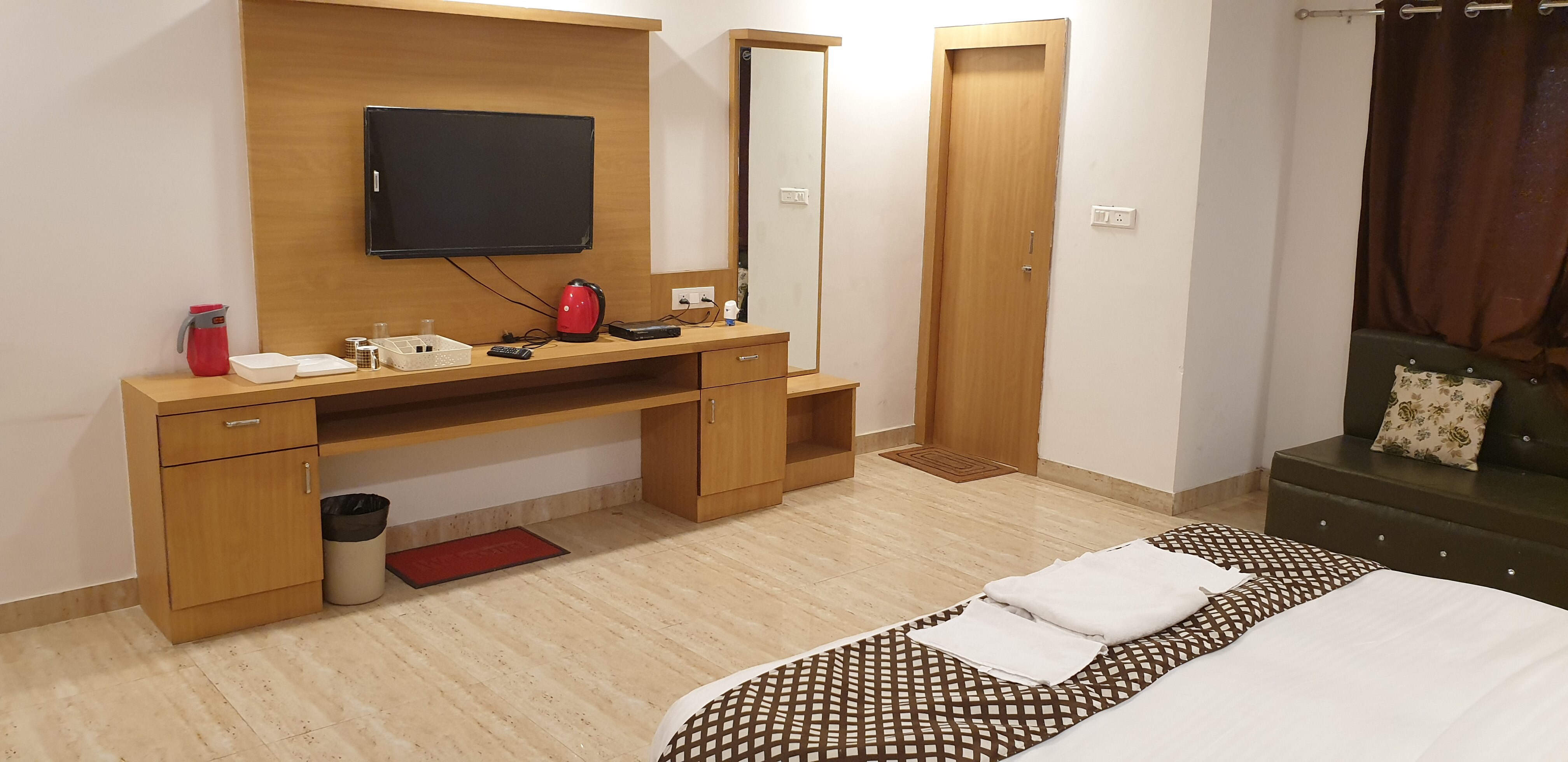 - Each of the rooms has an attached bathroom with toiletries. The rooms are furnished with facilities such as TV, intercom, wifi, smoke detector, air conditioning, chair, pillows, geyser, mirror, telephone, work desk, and more.