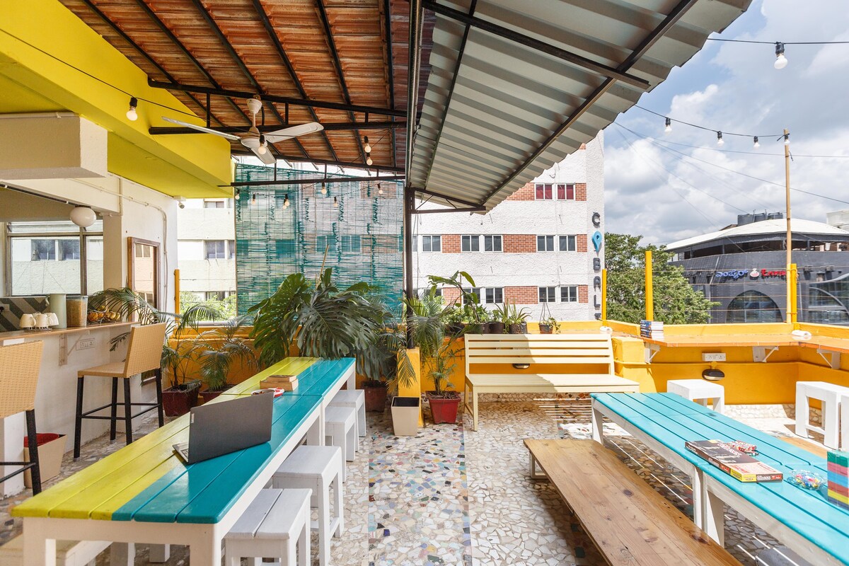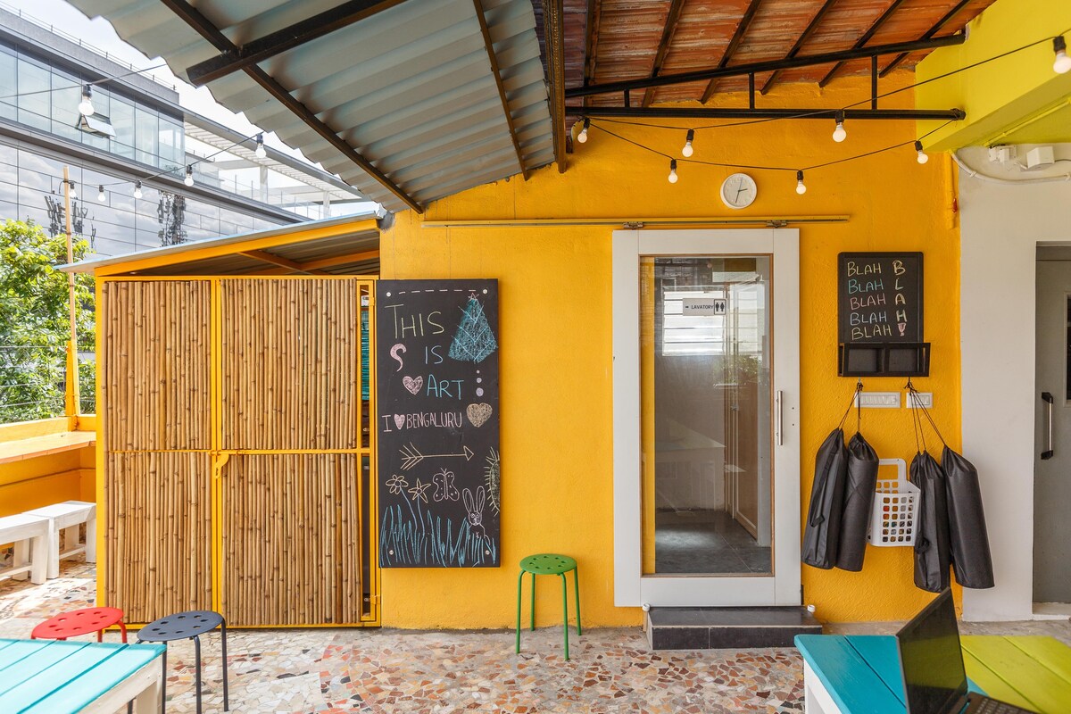 Discover a centrally located hostel on Bangalore’s Church Street, featuring a workspace, communal areas & kitchen. More