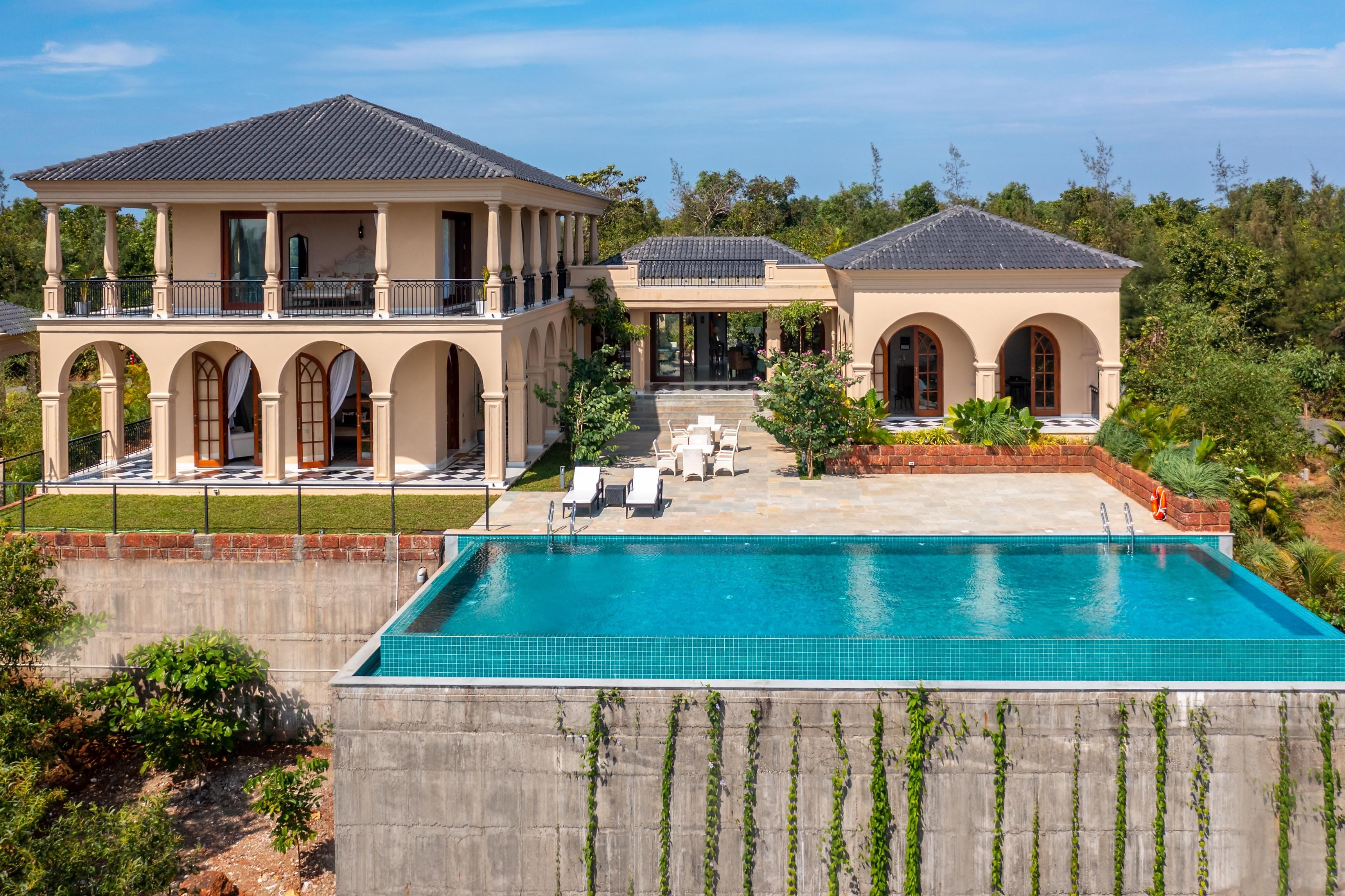 Relax at this lavish Mediterranean-style villa with an infinity pool, nestled in the hills overlooking Ashwem Beach. More