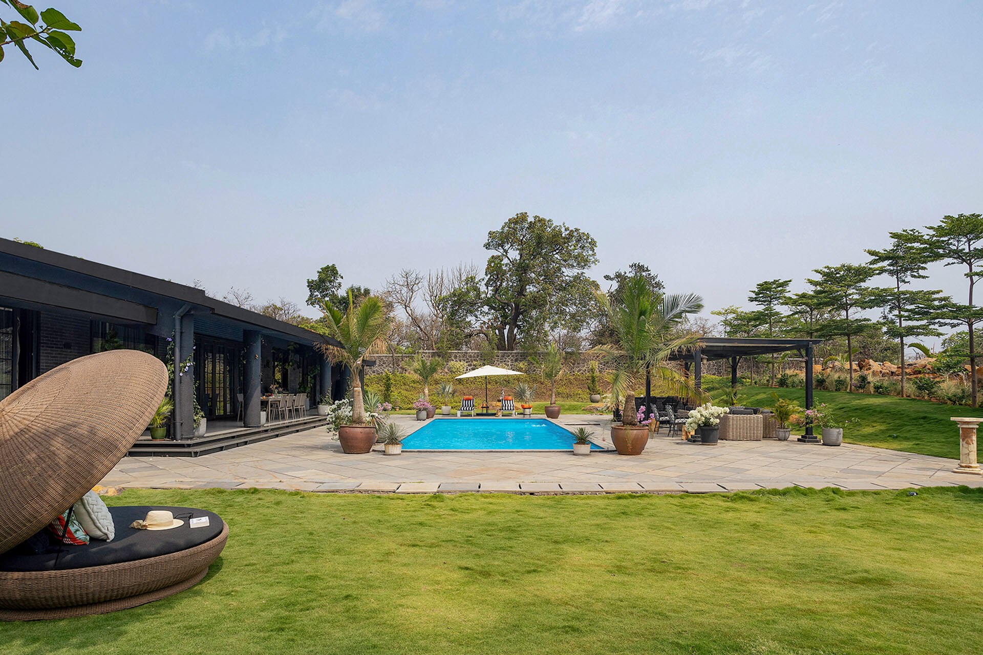Experience a blissful stay at this contemporary villa near the Western Ghats featuring an azure pool & well-furnished gazebo. More