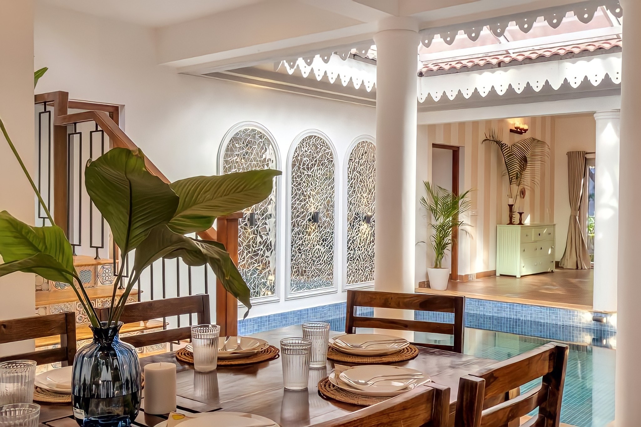Luxury villa with an indoor pool, kitchen & a dining area