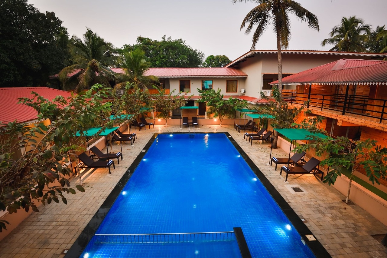 Embrace coastal living at this scenic property in South Goa, featuring wooden cottages, quad rooms, a spa, & a pool. More