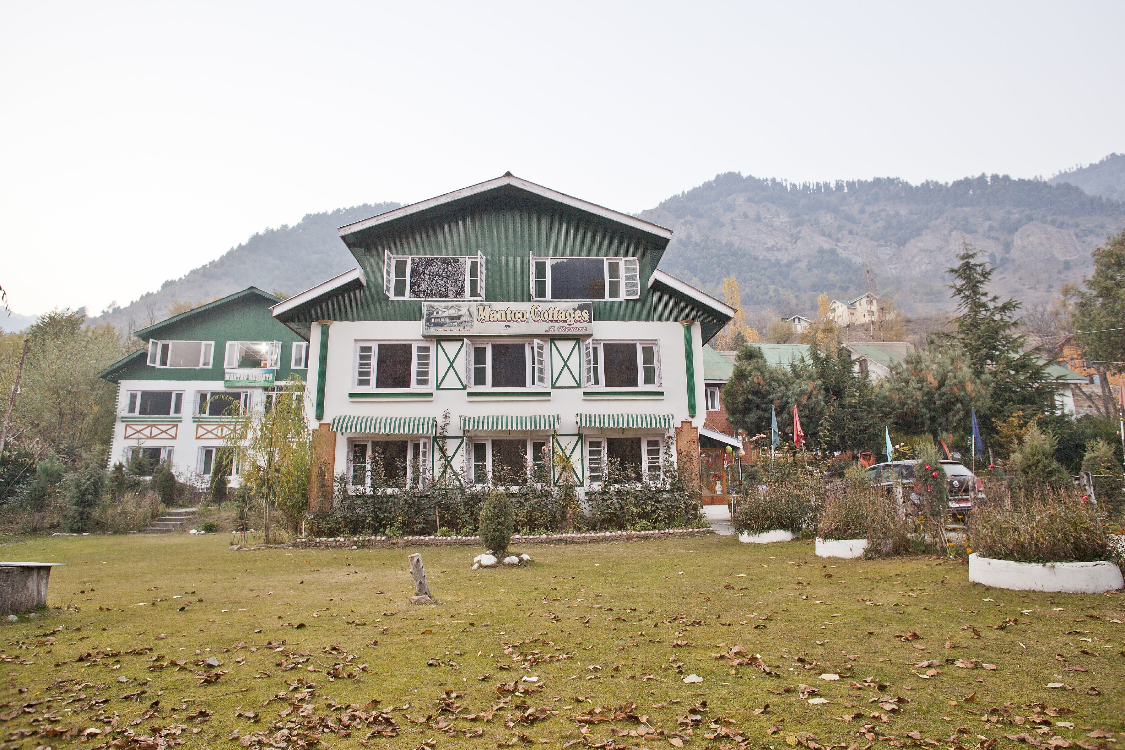 Located in the Laripora neighbourhood, the property is surrounded by the lush green hills of Pahalgam.