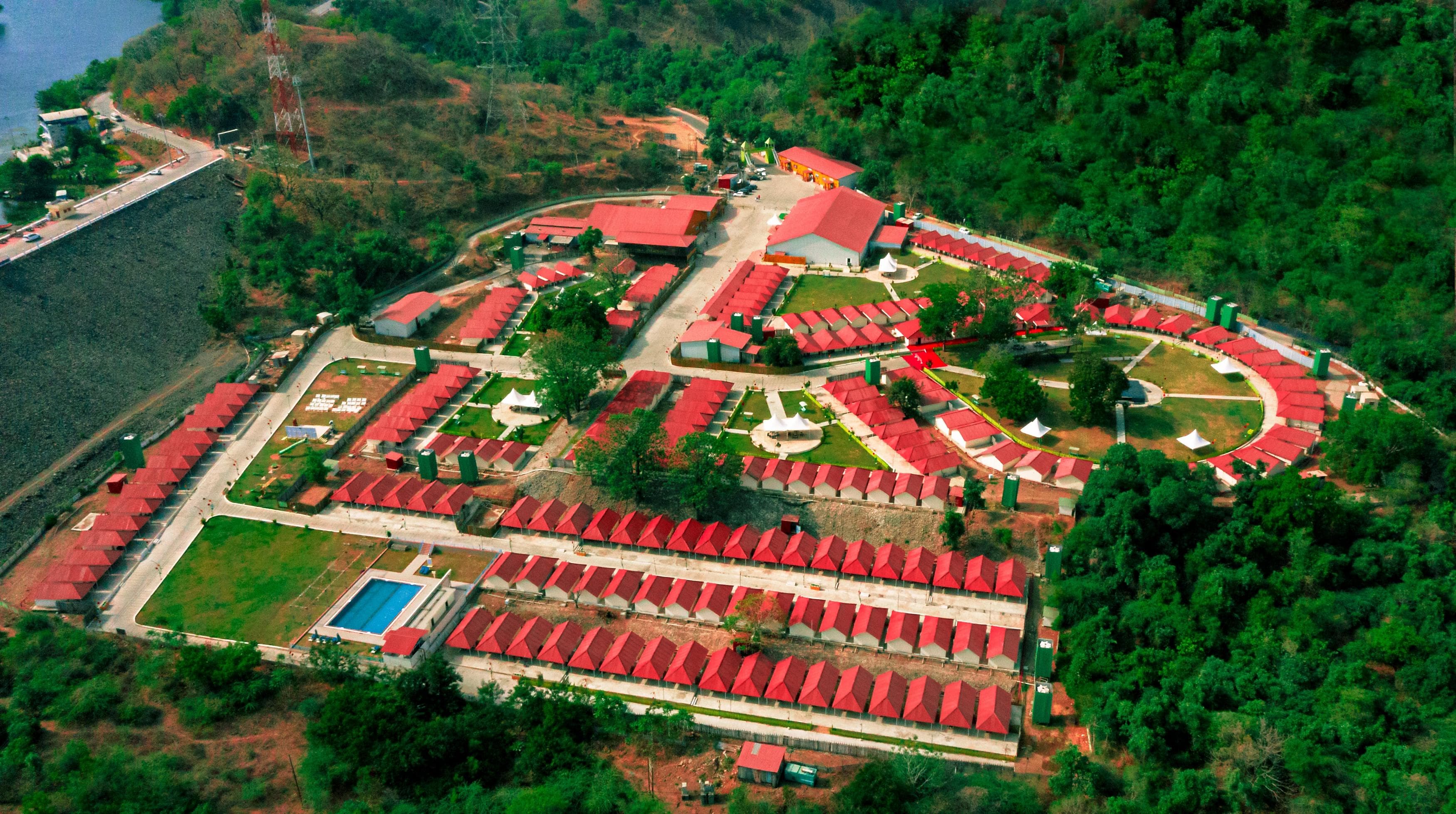 Stay near Sardar Sarovar Dam at this scenic tent city featuring an outdoor pool, lawn, gazebo & kids’ play zone. More