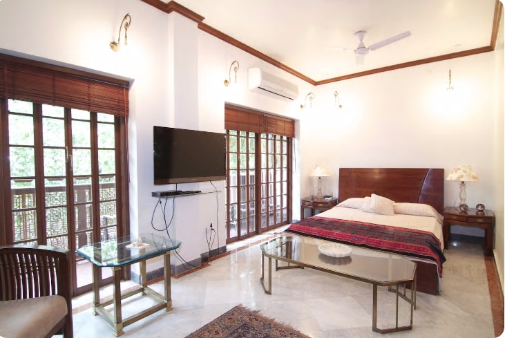Visit the sumptuous 2BHK immense apartment facing the lake situated in Hauz Khas. The house has a living room and a TV sharing lounge. More