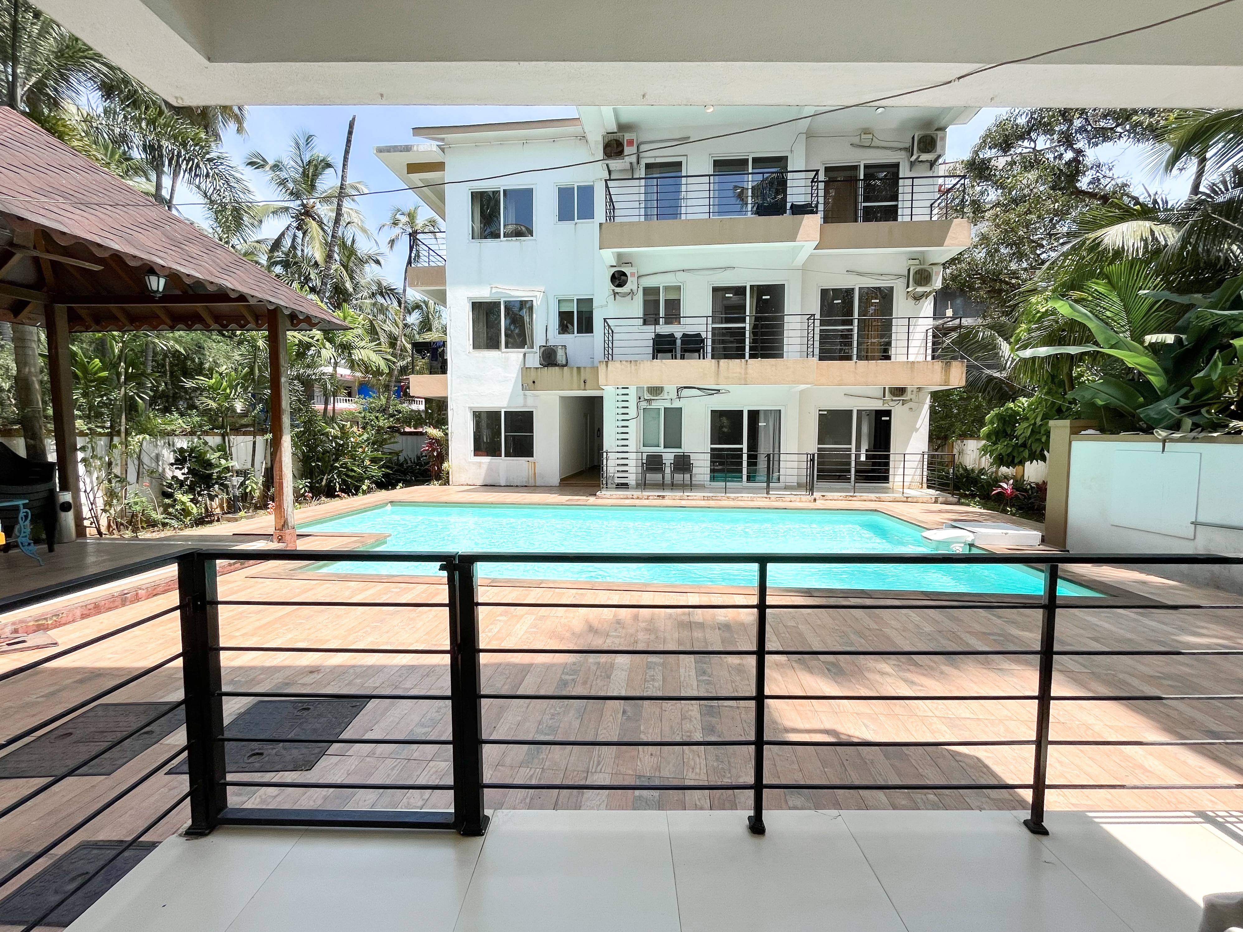 Apartment featuring a pool, kitchen, living room & a gazebo