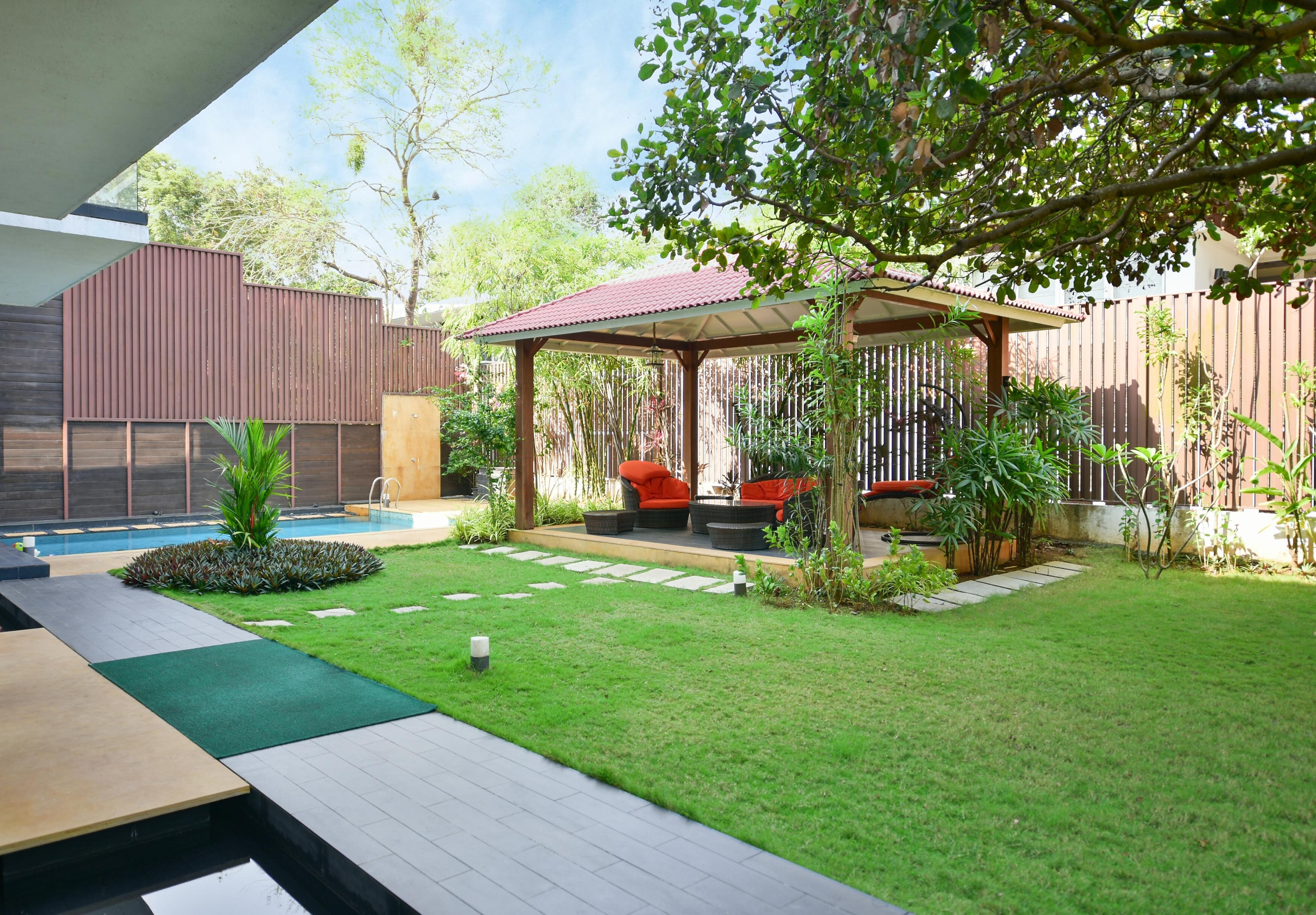 Pool villa with a gazebo, living room, kitchen & a lawn