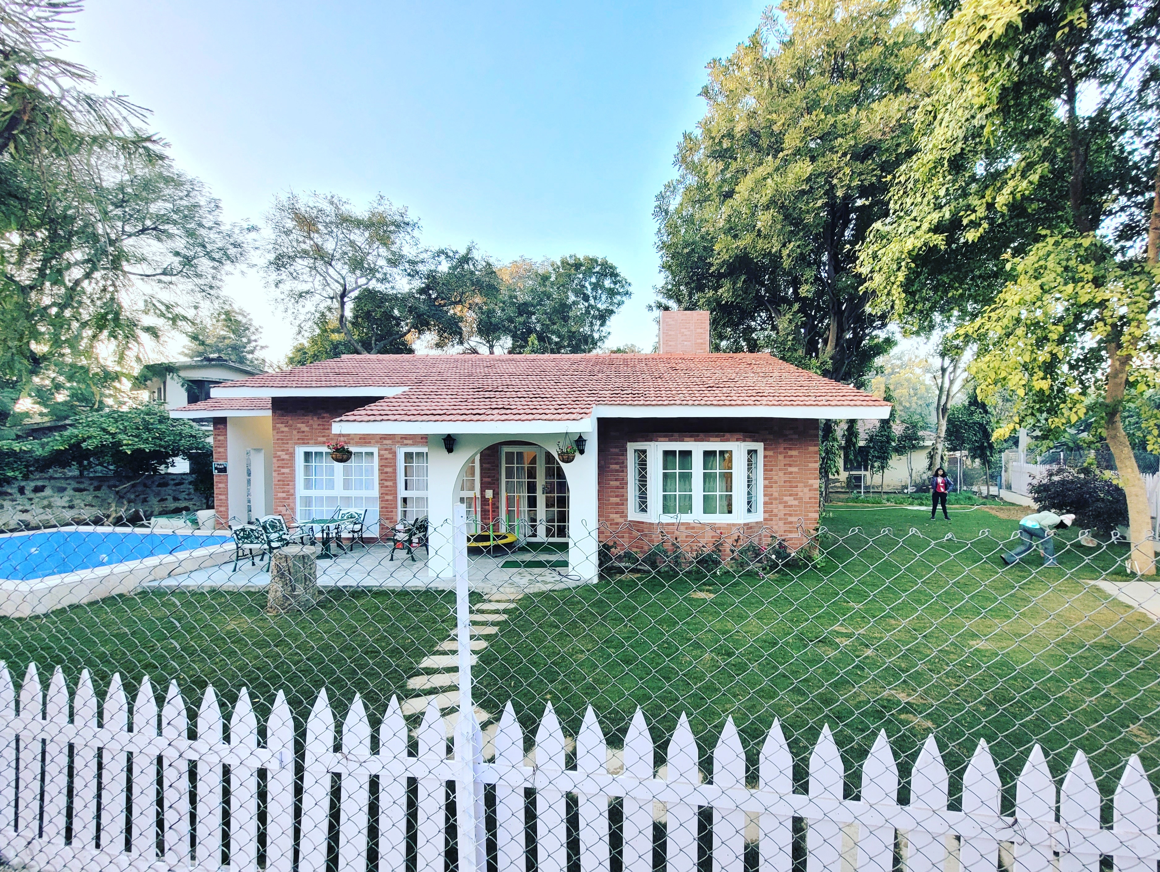 Pool villa with a kitchen, living room, sit-outs & a lawn
