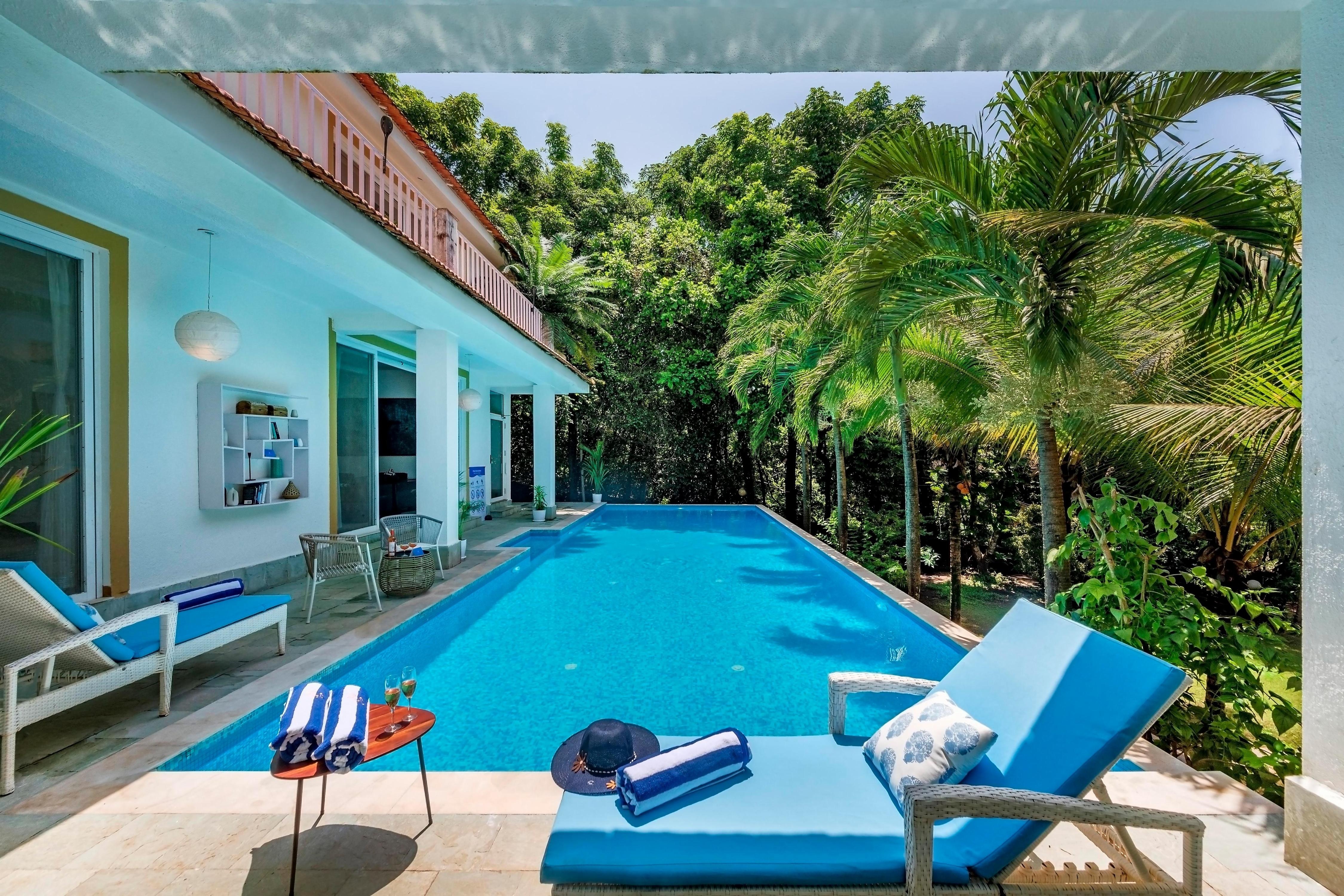 Escape to a 4-bedroom villa in Assagao, featuring a swimming pool, Jacuzzi, balcony, lawn & lush greenery. More