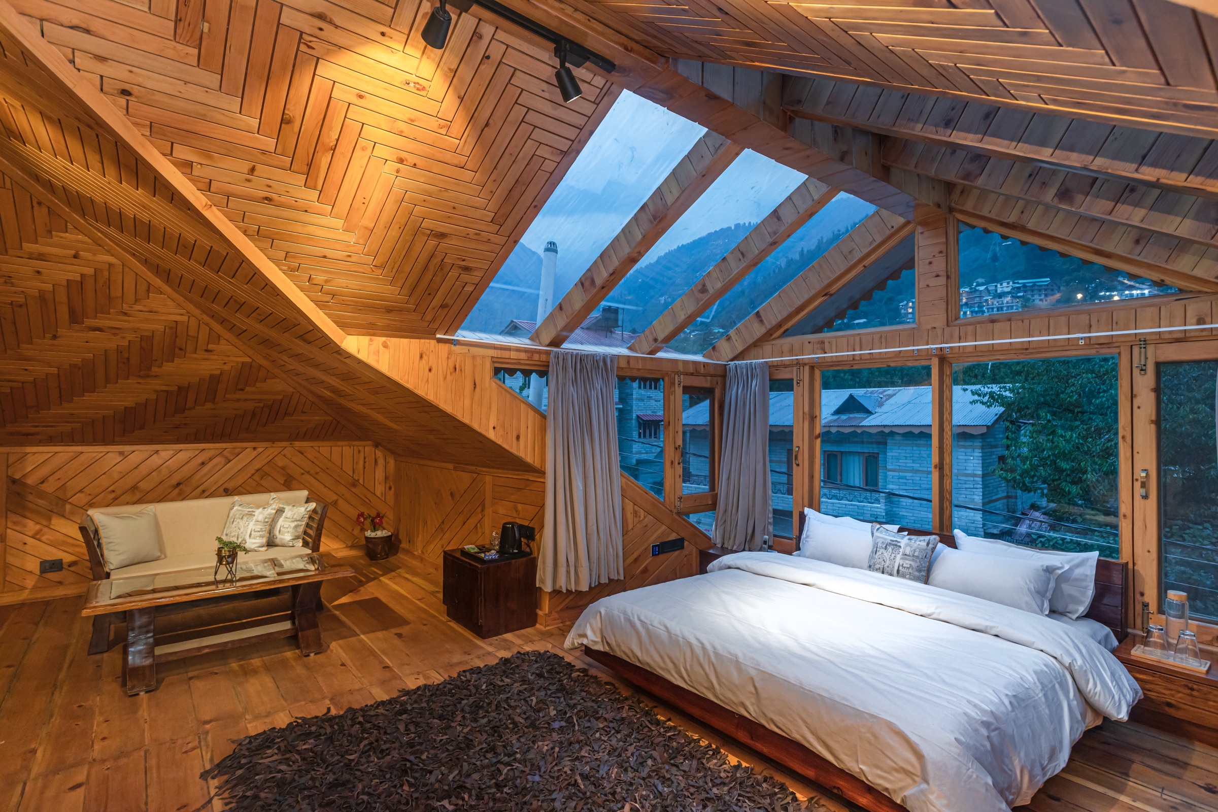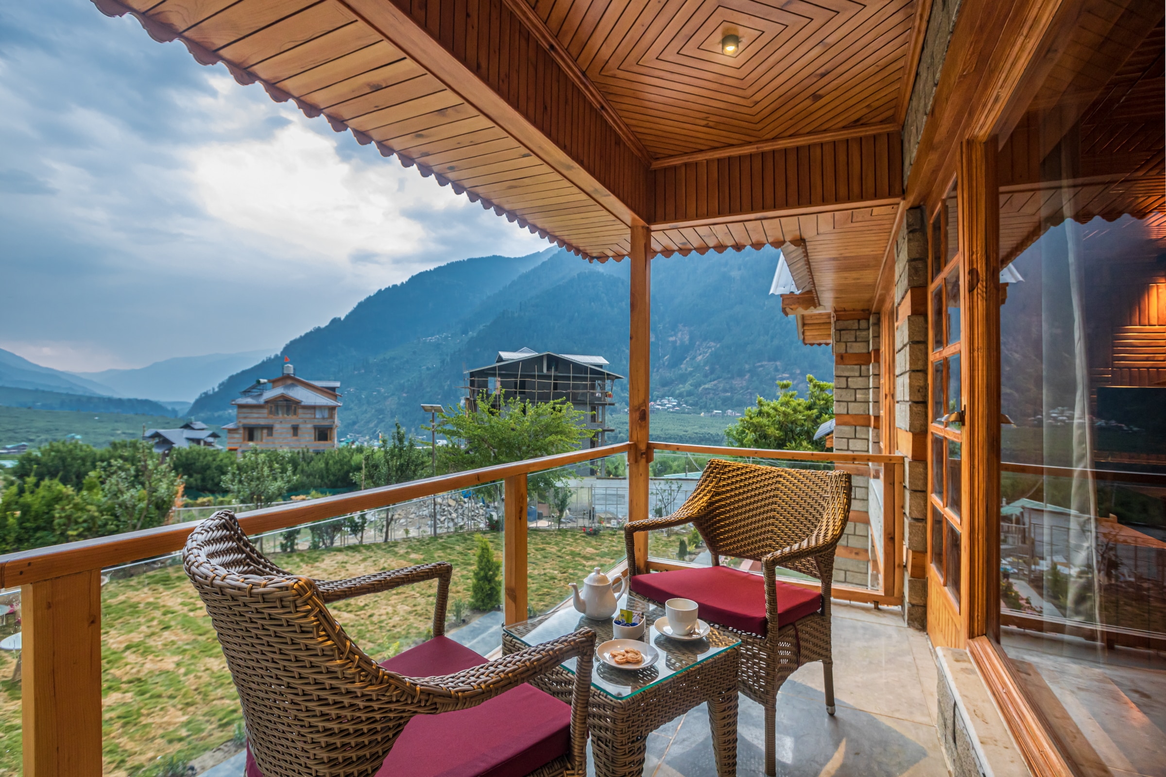 Discover a restored heritage villa in Manali, featuring cedarwood interiors, a Jacuzzi, bathtubs, lawns & bonfire. More