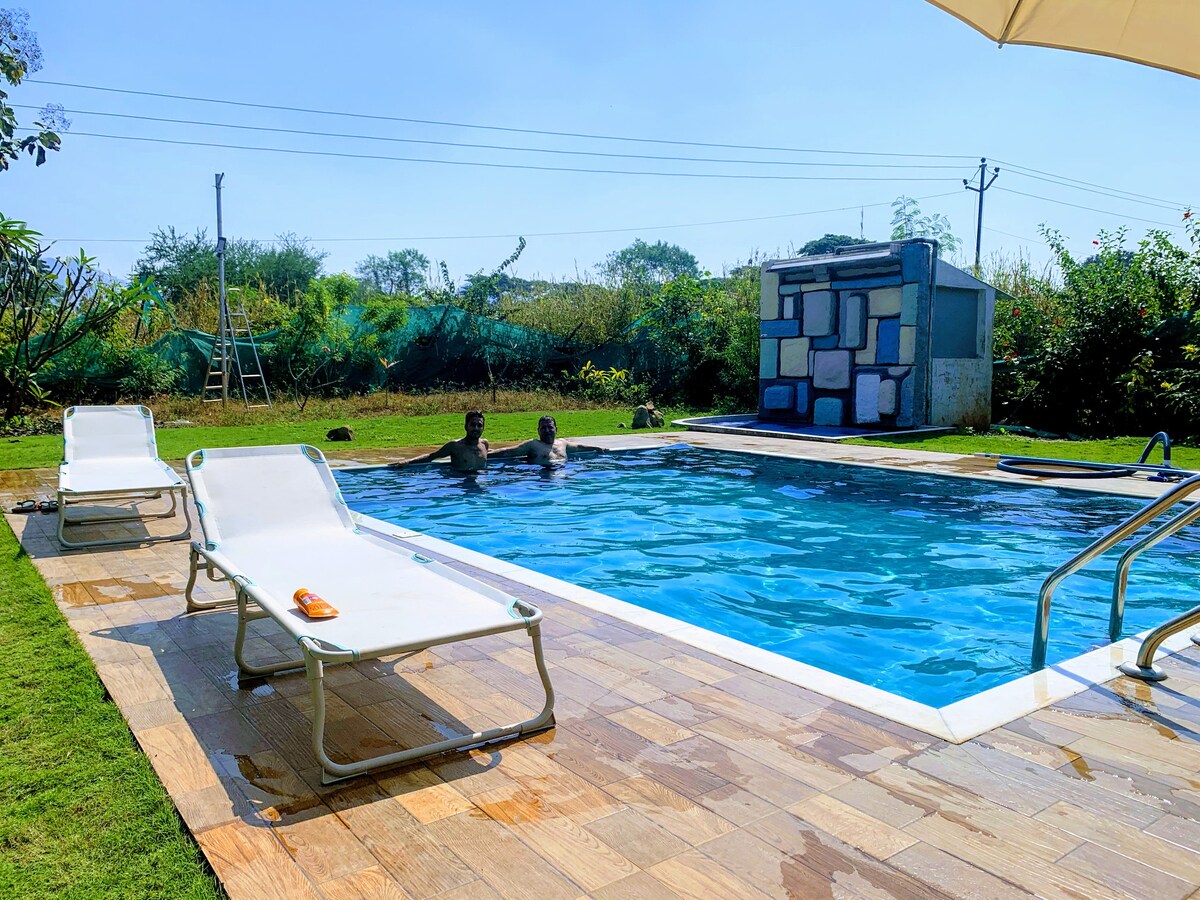 Entire 2 BHK villa with a pool, living area, caretaker, lawn & parking