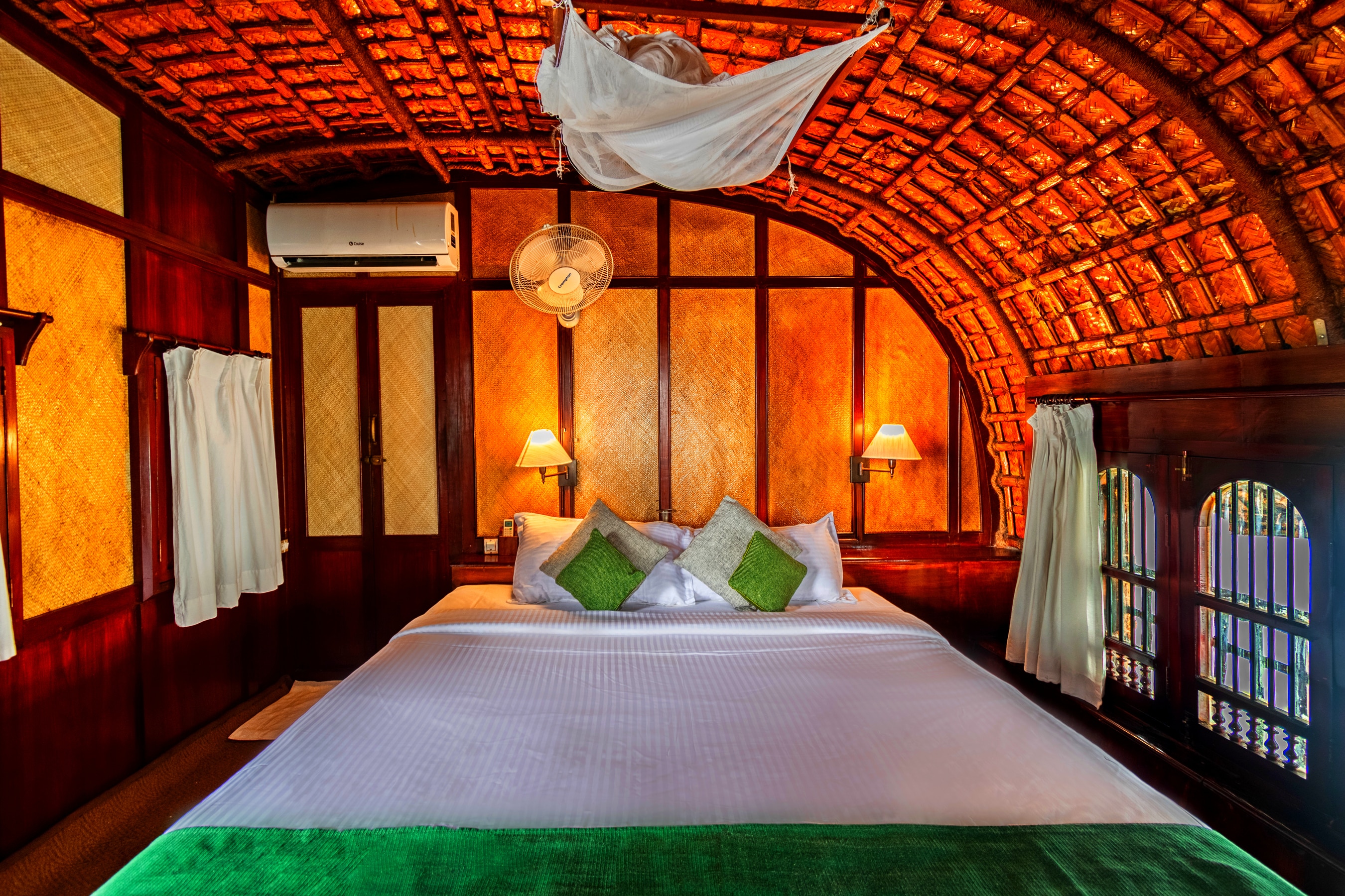 Traditional houseboat with plush rooms & a dining setup