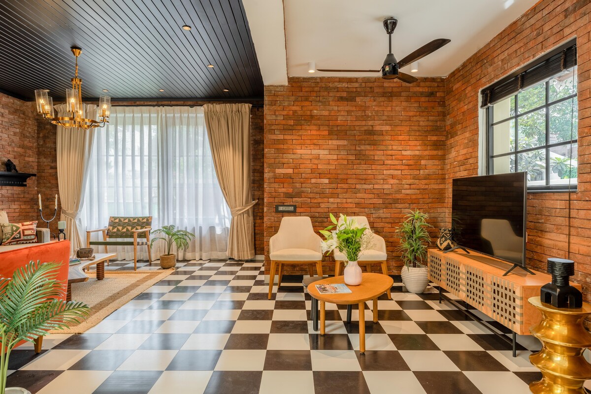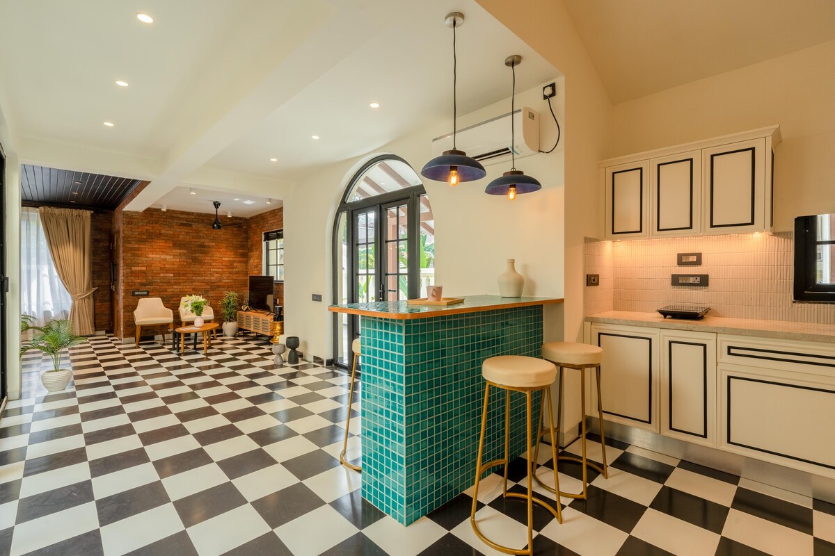 Stay in Anjuna at a 3-BHK villa featuring a private pool, rooftop bar, patio, modern interiors & a designer kitchen. More