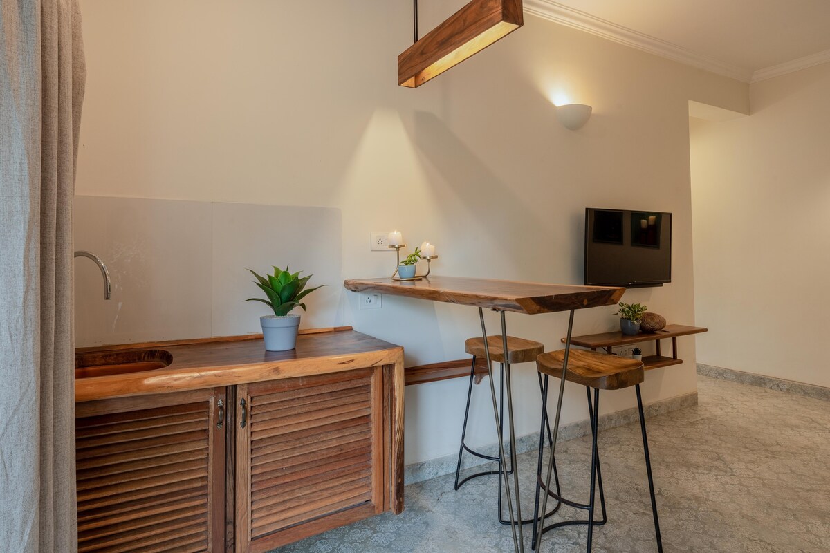 Unwind in Vagator at a Balinese-style villa featuring a fully-equipped kitchen, pool, deck, patio & private balcony. More