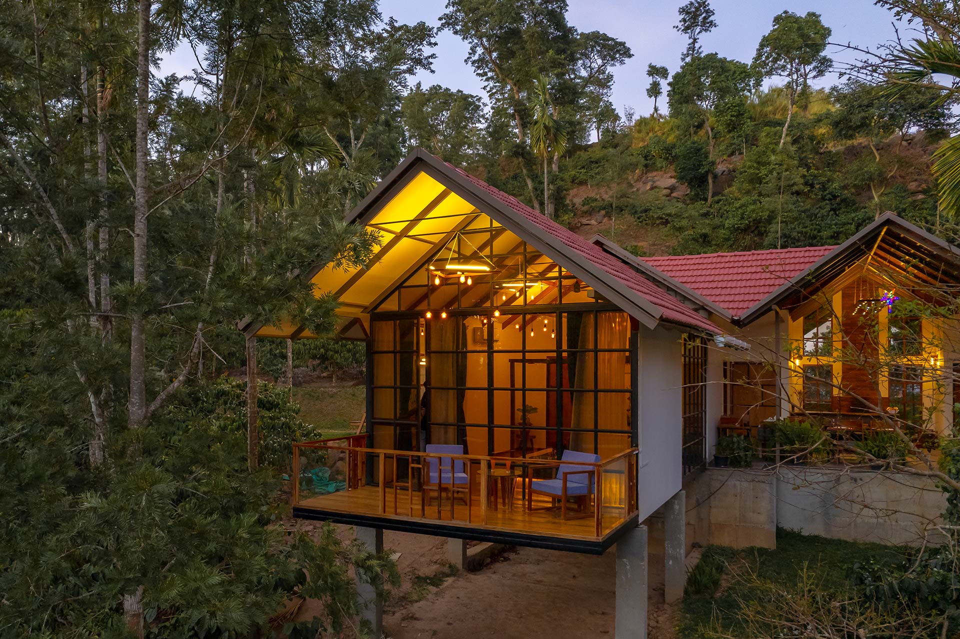 Nest away with the finest, most aromatic smell of coffee amidst lush green at this rustically designed lakeside villa. More