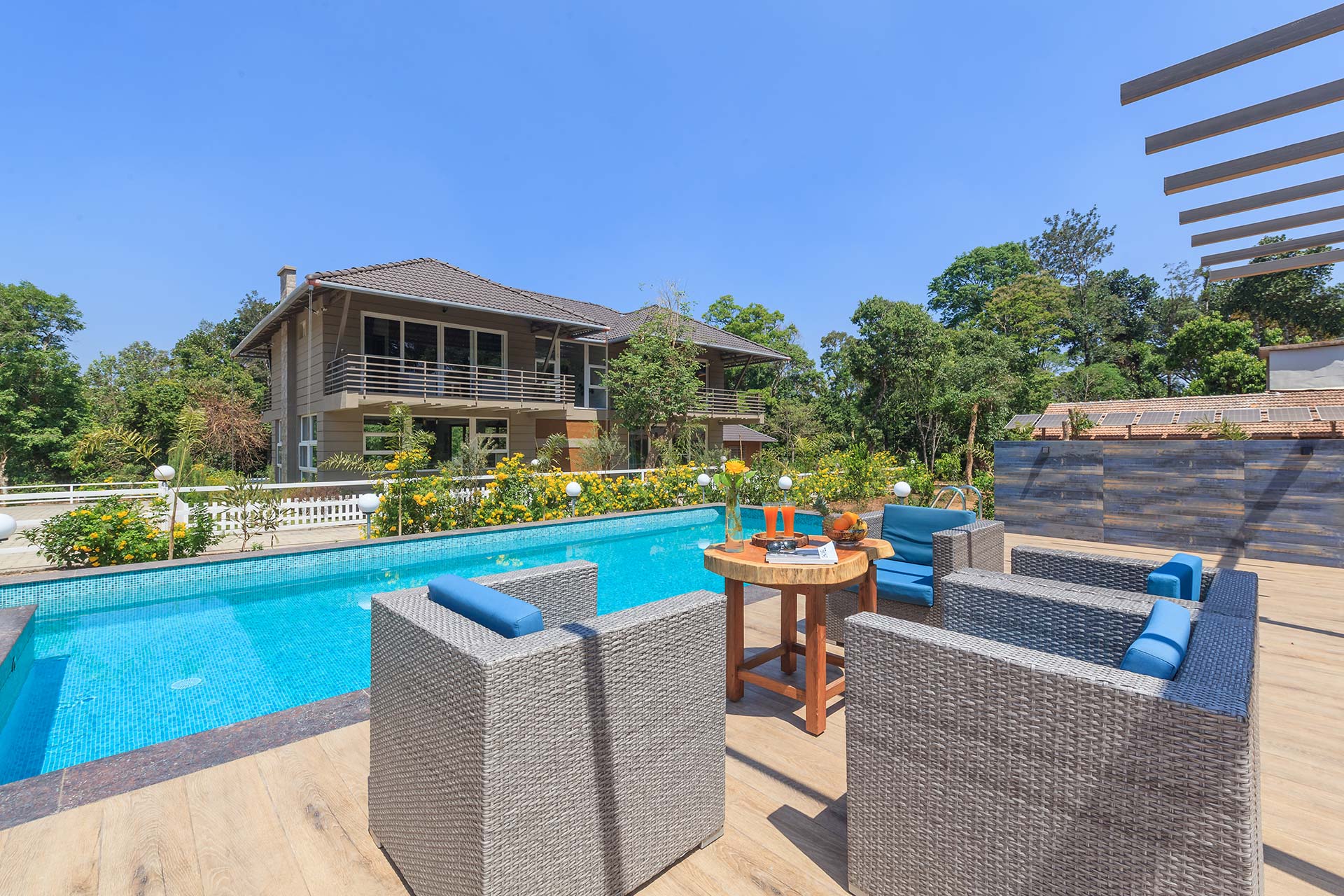 Serene villa with an outdoor pool, bar, living room & sit-outs