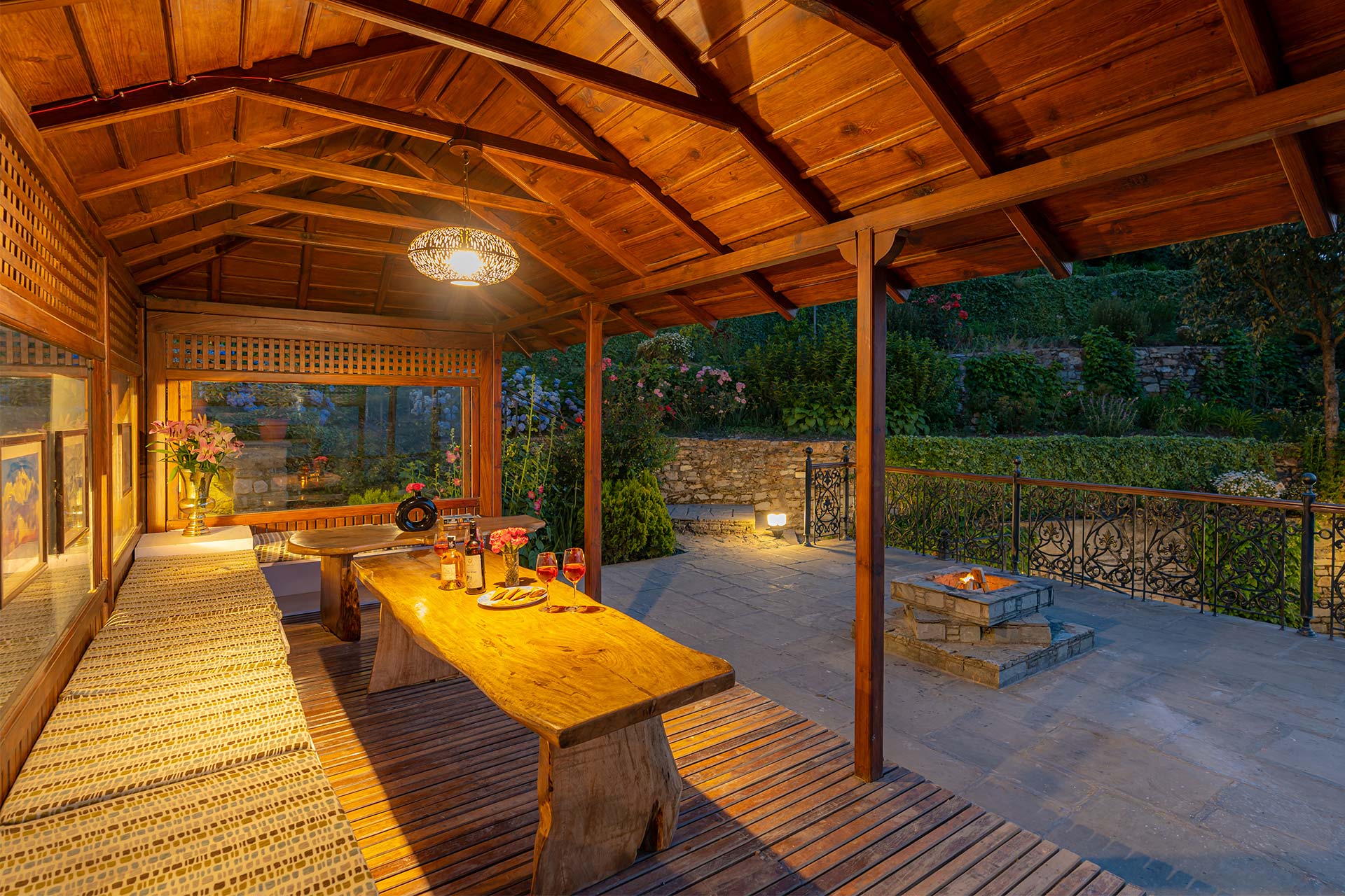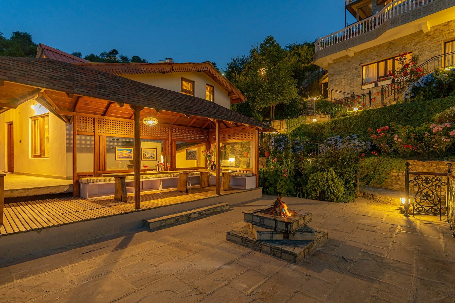 Villa with a fireplace, bonfire, lawn, sit-outs & mountain views