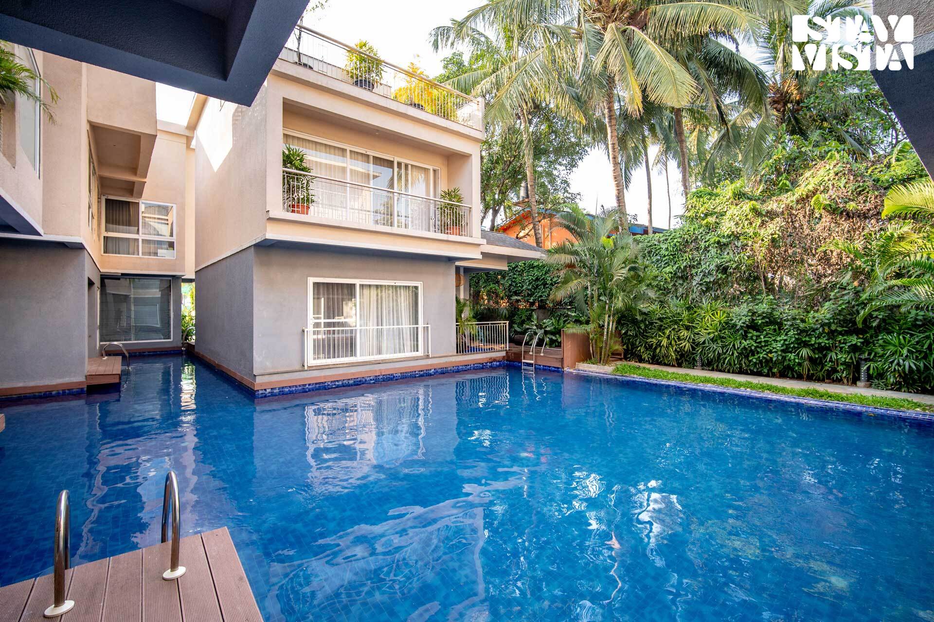 Unwind at a 4-bedroom villa in Goa, featuring a Jacuzzi, terrace, shared pool, clubhouse games & lawn spaces. More