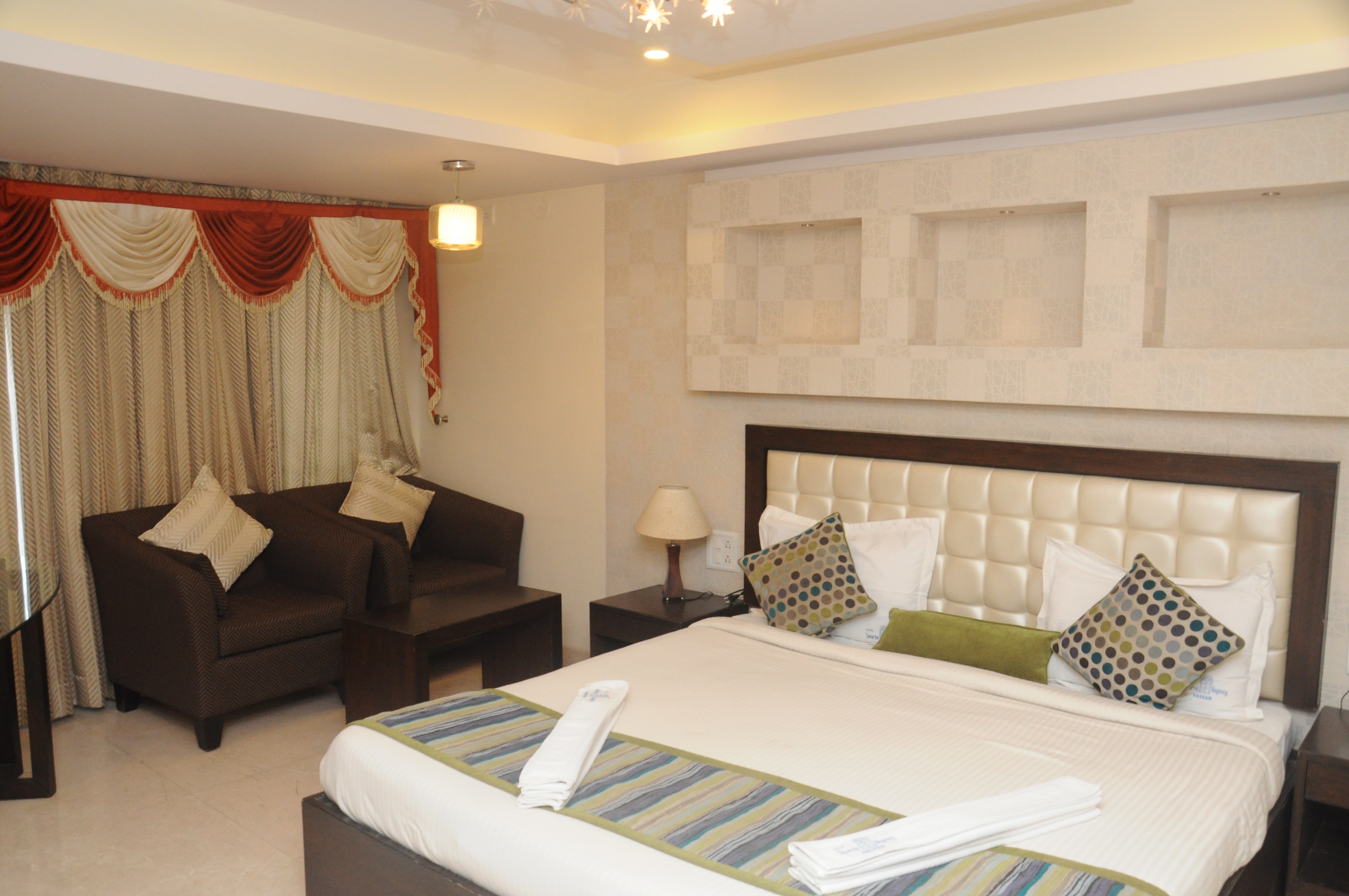 Hotel Suvarna Regency is situated around 2.4 km from the Hassan KSRTC Bus Stand, and 3.4 km from the Hassan Junction.The nearest airstrip is the Hassan Airport at a distance of 11 km, however, the Kempegowda International Airport is approximately 207 km away.