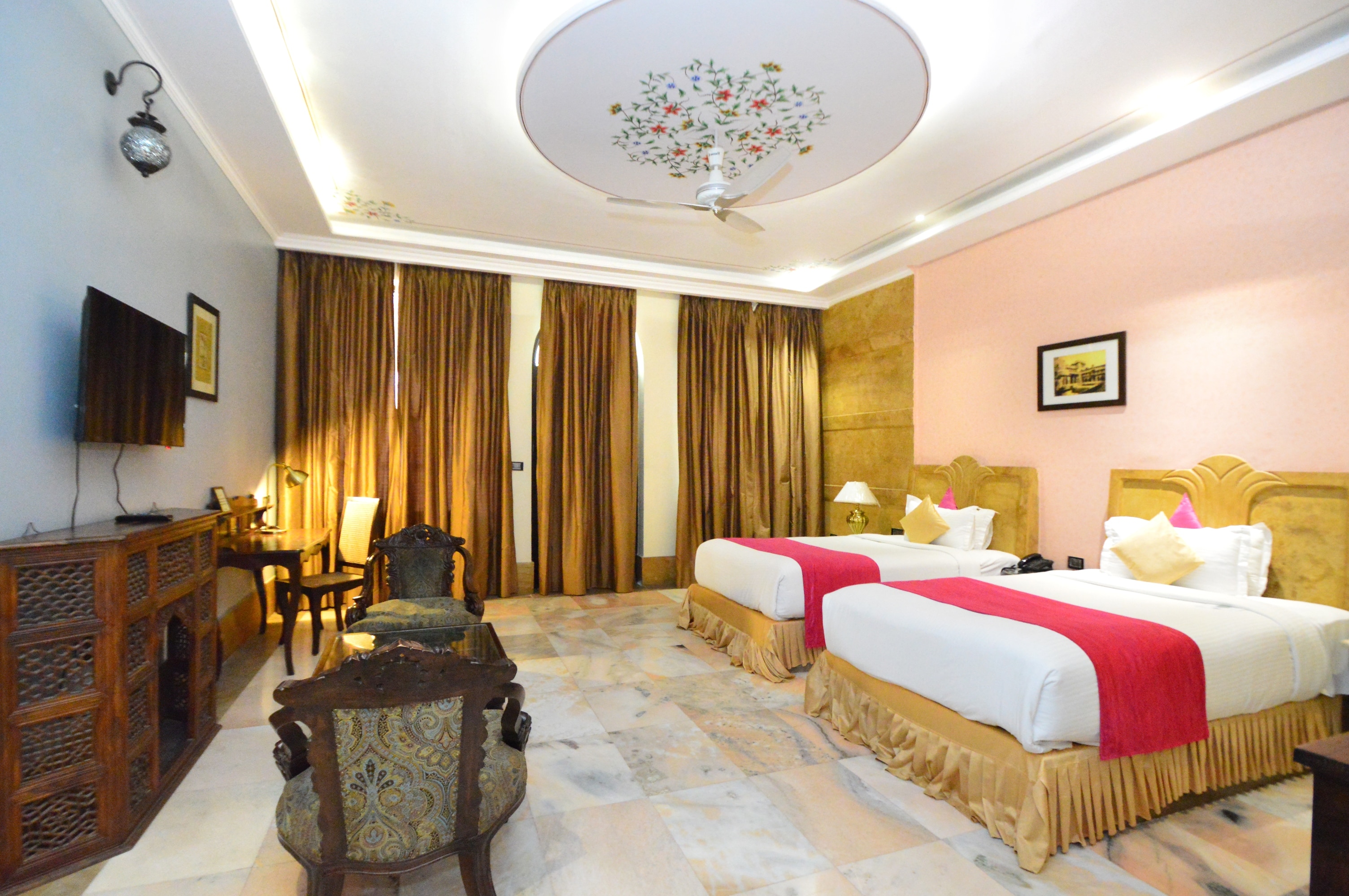 Reside in a regal setting at Talao Bagh Palace, Jaipur which is equipped with artefacts and antique-style furniture, hand-painted frescoes and miniature paintings