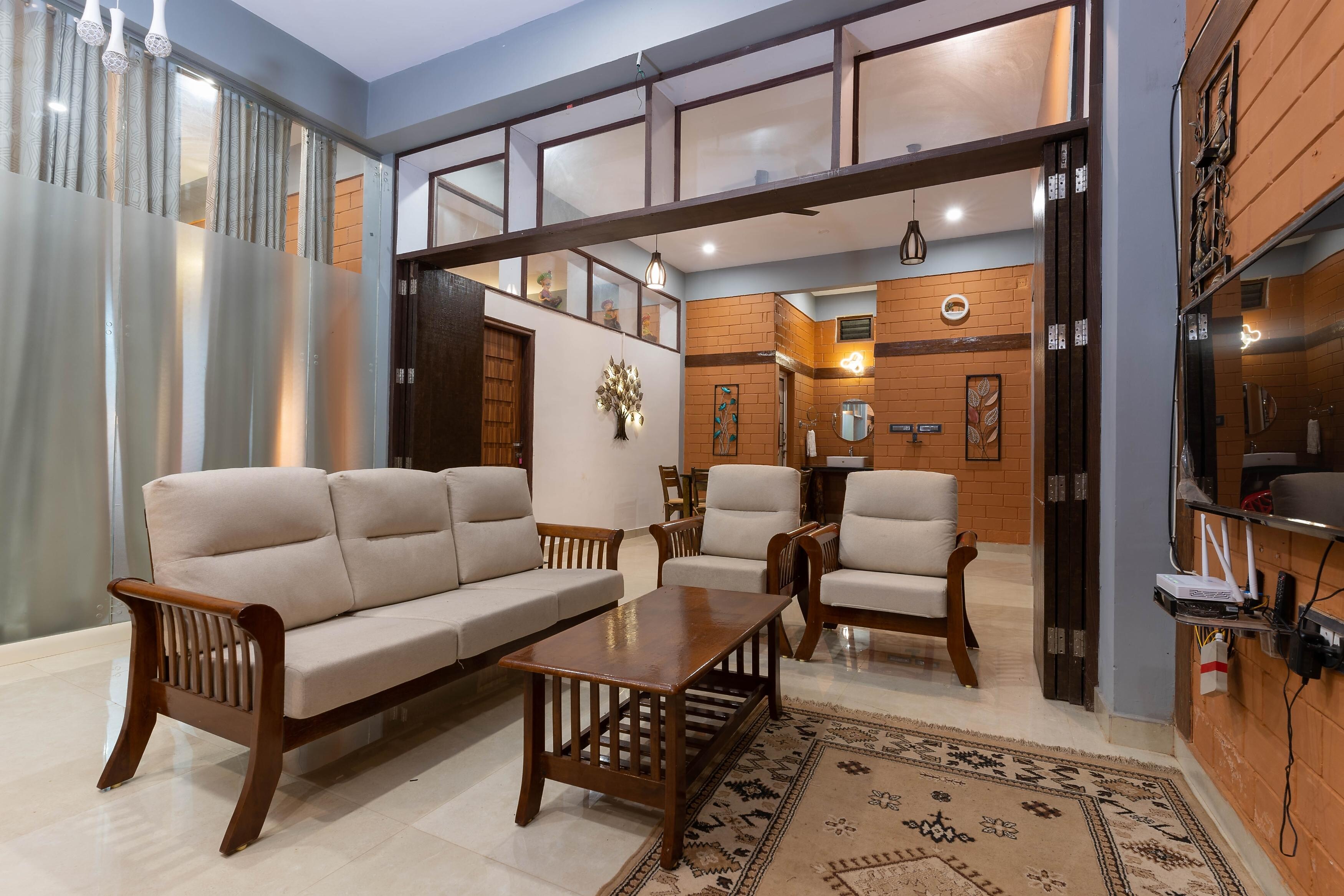 Entire 3 BHK villa featuring a kitchen, living room, bonfire & parking