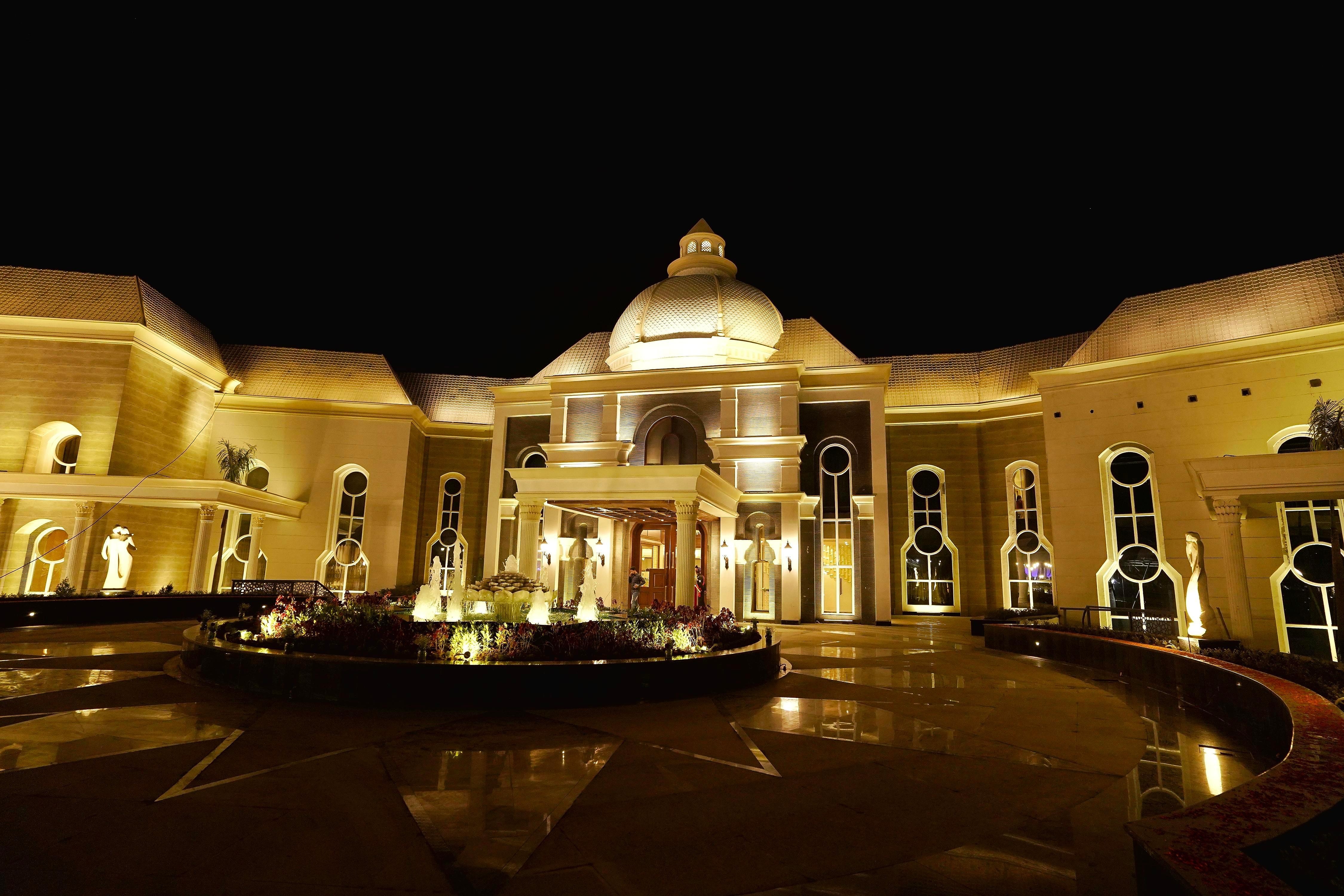 An expansive hotel featuring lush green lawns, rooms with private balconies, and a multi-cuisine restaurant. More