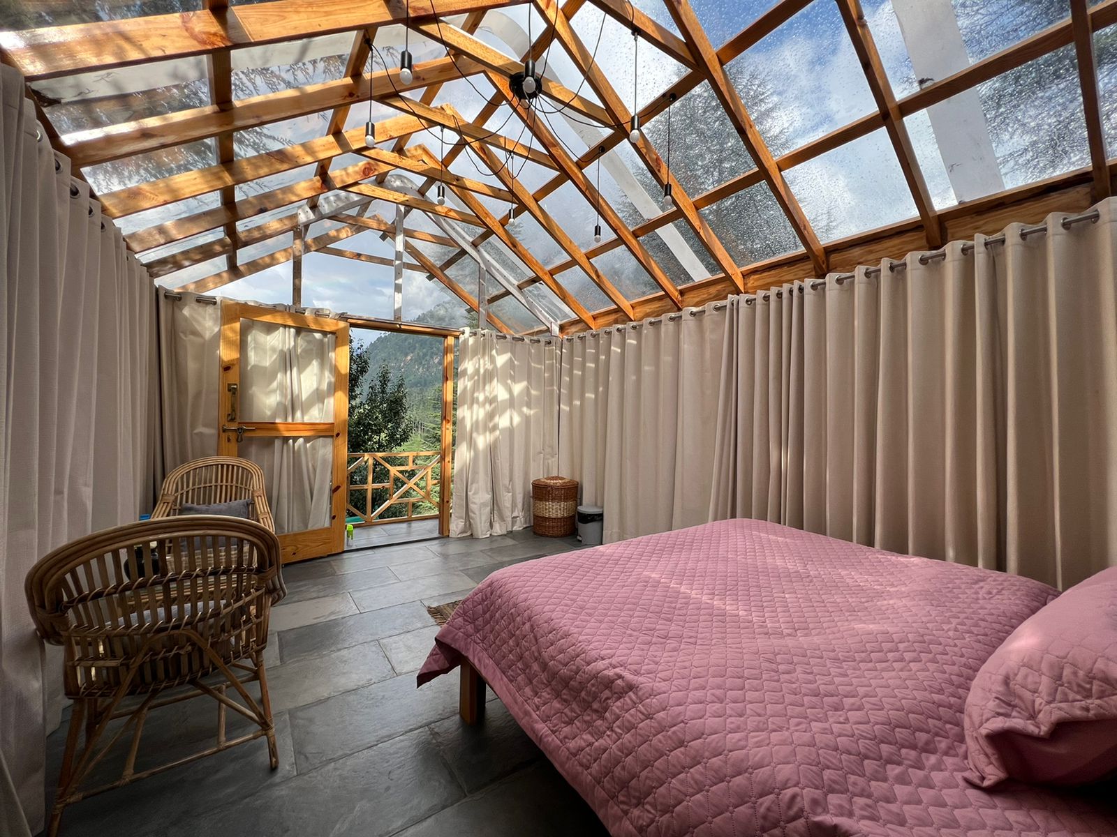 Stunning vacation home surrounded by pine trees & apple orchards, offering uninterrupted vistas of the Himalayas. More