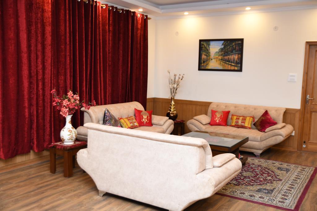 The apartment (2000 sq ft) has 3 rooms each with one King size bed and 1 sofa bed and attached bathroom with geysers and water mixers.The rooms have a sitting area, dressing area, wooden wardrobes, widescreen television and 4G Wi -fi. The apartments have a view of the beautiful mountains surrounding the area.