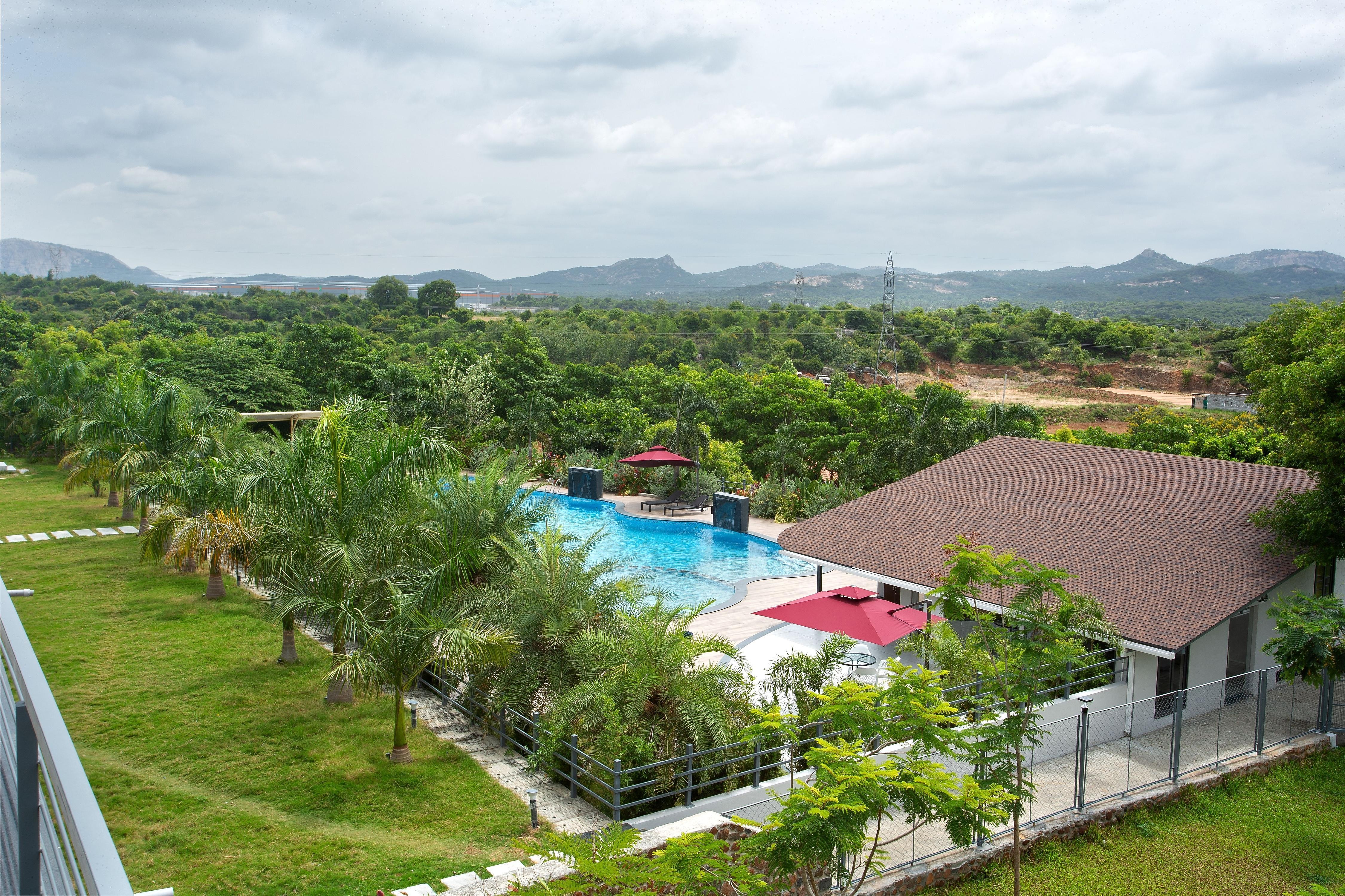 A serene hillside escape in Krishnagiri featuring private pool villas, a spa, a swimming pool, and a multi-cuisine restaurant. More