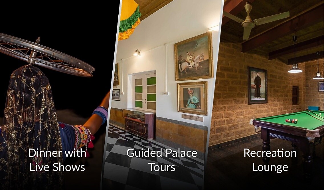 The property has 18 luxurious and well-furnished rooms and suites categorized as Standard Room, Golden Suite, and Maharaja Suite. Standard Room (200 sq ft) comes with an option of a double bed or twin beds, a seating area and rich interiors.Golden Suite (480 sq ft) offers a well-appointed bedroom and a separated living room section furnished with a seating area. Maharaja Suite (144 sq ft) is the most spacious and luxurious room with a well-appointed room, a separate living room, and a private balcony.All rooms are furnished with antique furniture and open to the palace views.