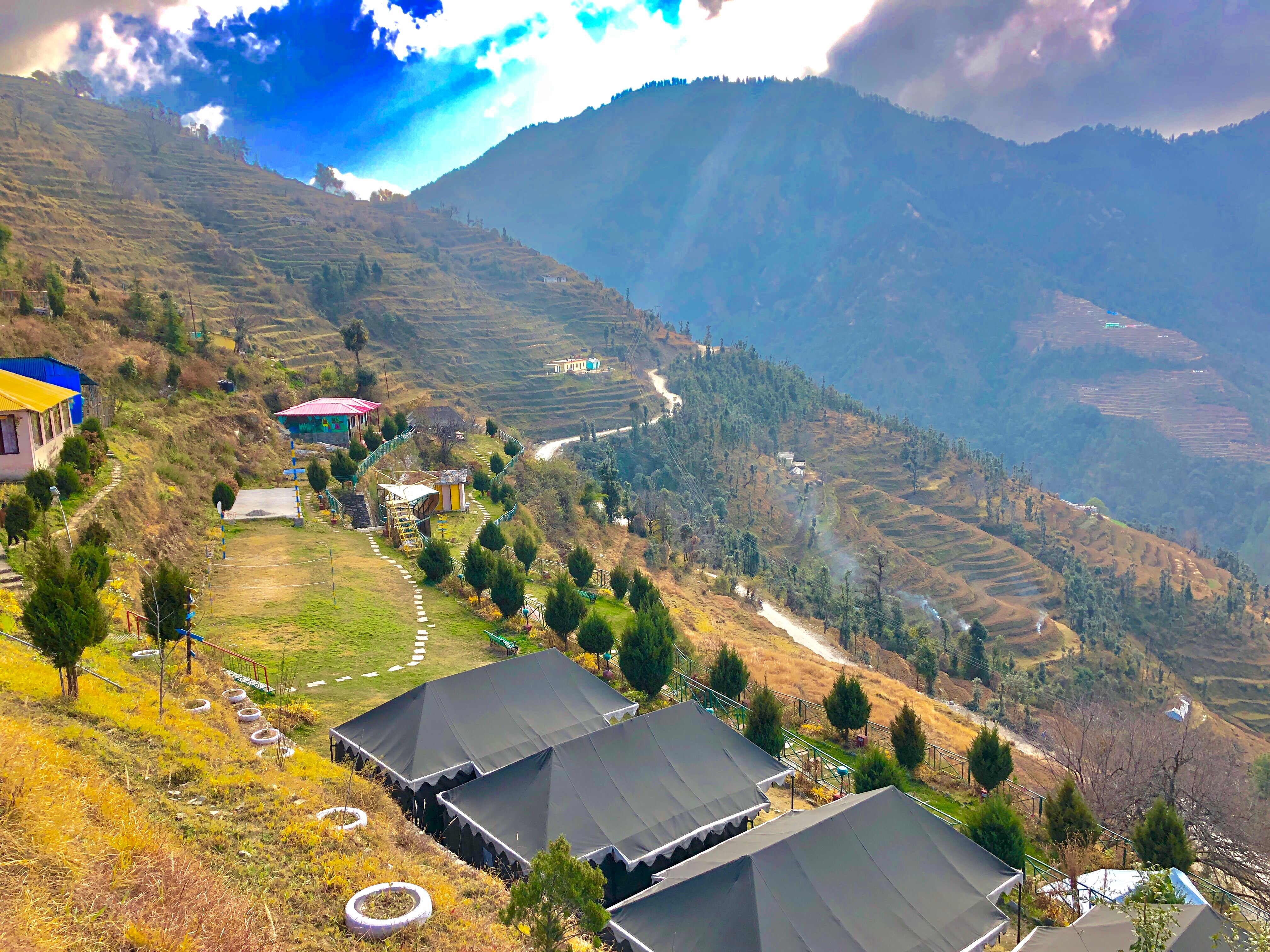 - Whispering Pines comprises 13 Alpine Swiss Tents (12’X12’) with well-appointed interiors and well tiled attached baths and 2 Alpine Mountain Cottages.
